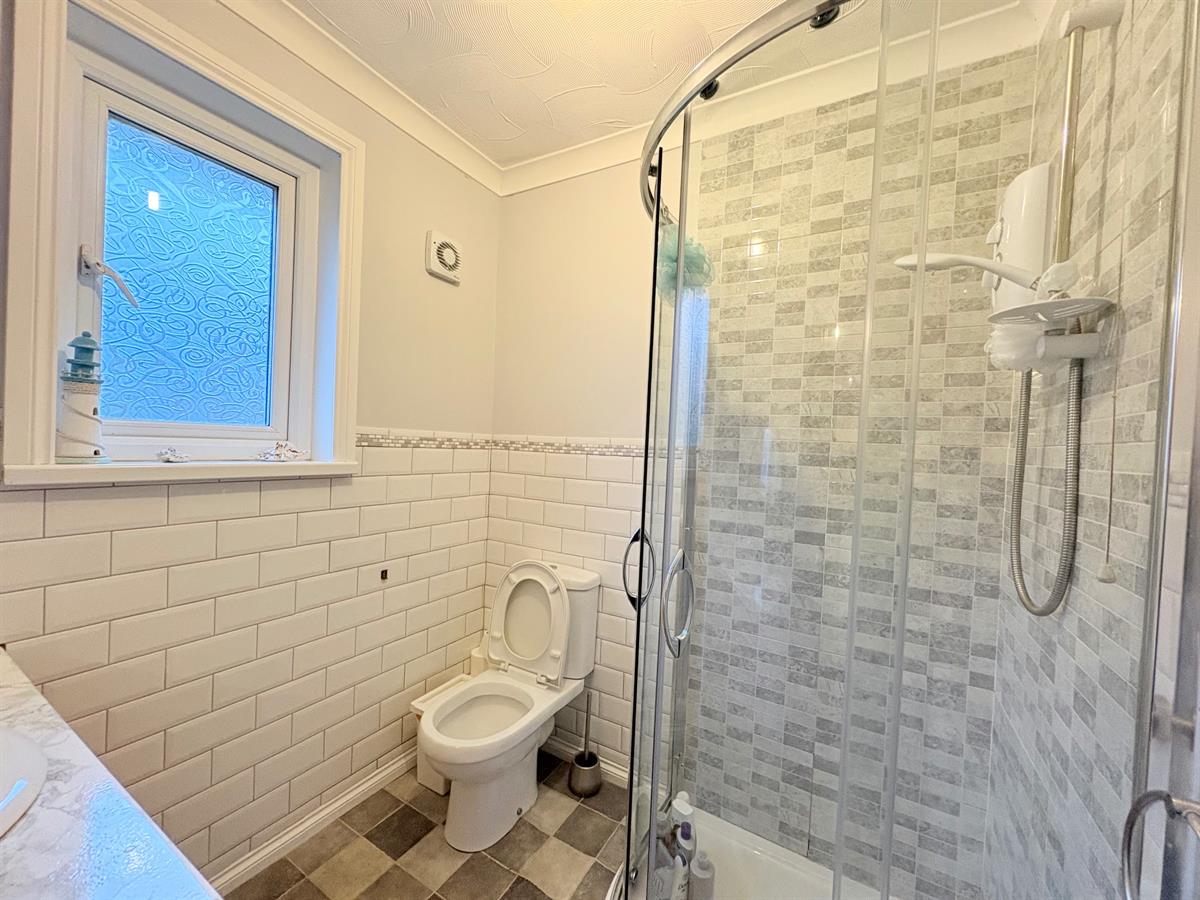 Brown door with silver handle, grey tiled flooring, white skirting boards, walls half grey painted, half white tiled, one white radiator, white sink with silver tap with white tiled and wooden cabinet below, white toilet, grey tiling surrounding electric shower, clear sliding doors, one frosted window overlooking rear.