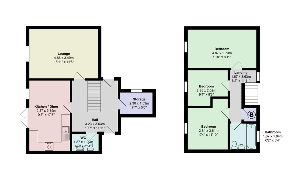 The first floor of the property offers space and practicality with a lounge perfect for relaxation, a kitchen/diner, storage room, and downstairs WC.