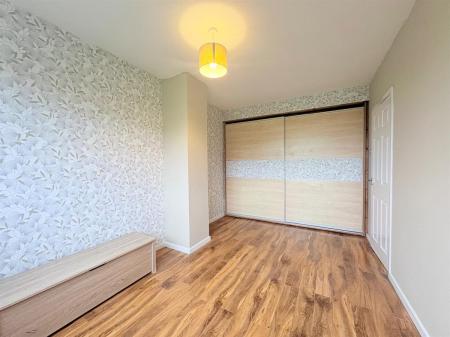 White door with silver handle upon entry, wood affect laminate flooring, white skirting boards, two beige painted walls, two flower wallpapered walls, one white radiator, one window overlooking rear.