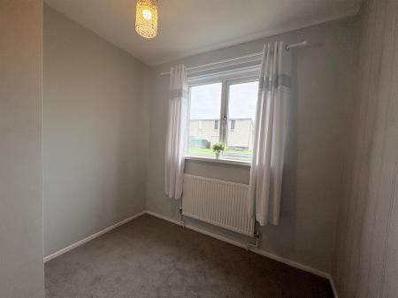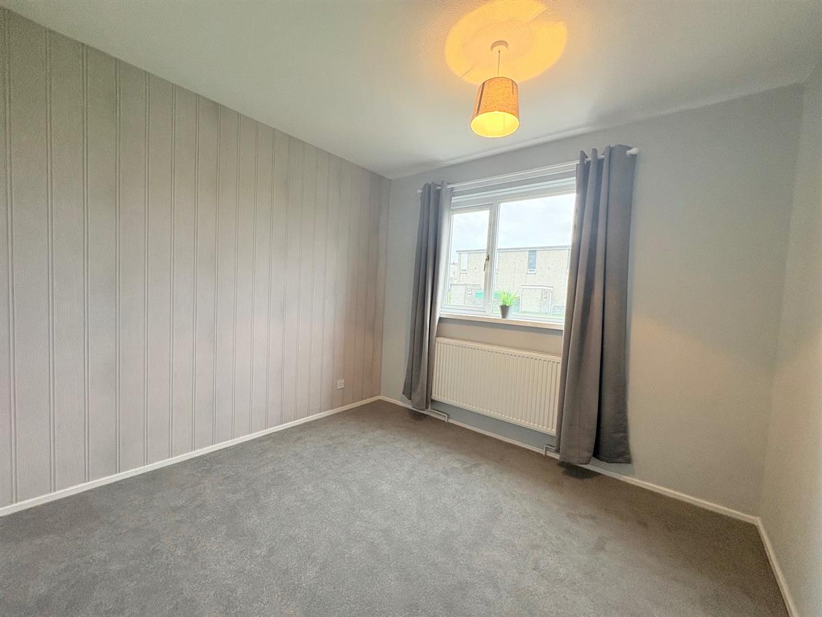 White door with silver handle upon entry, dark grey carpet, white skirting boards, light grey painted walls, one light grey wallpapered wall, one window overlooking rear, one single plug socket, one white radiator.