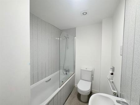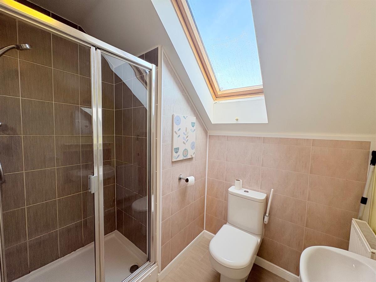 Velux window to rear aspect, plain ceiling, plain walls with tiled splashback, low level wc, pedestal wash hand basin, double shower cubicle with shower over.