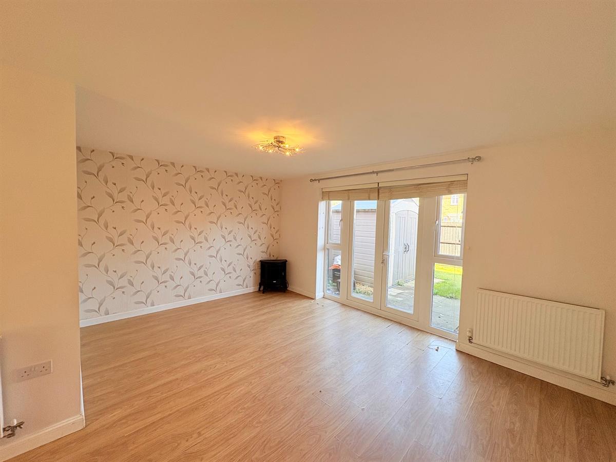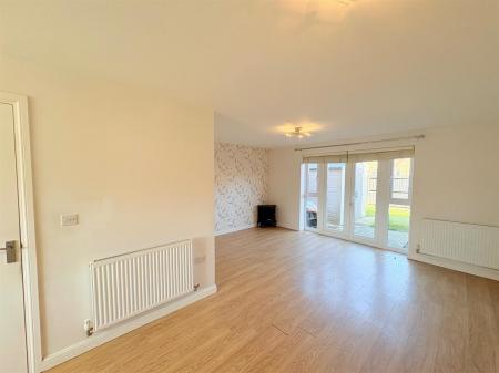 To the Lounge, plain ceiling, plain walls, carpet flooring, radiator, dining area, UPVC double glazed French doors leading to rear garden.
