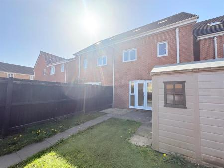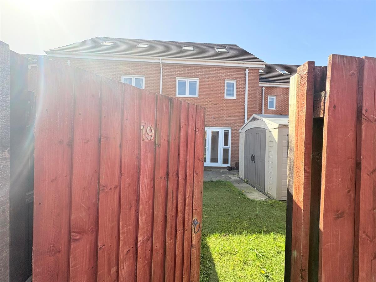 Rear - Fenced boundaries, laid to Astroturf, shed, gate leading to parking space.