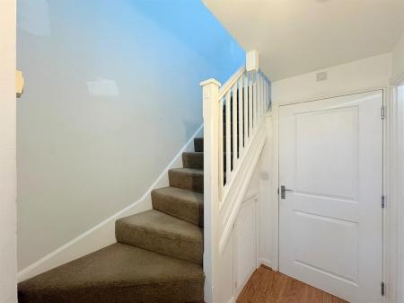 Enter via panelled door to hallway, plain ceiling, plain walls with feature wall, vinyl flooring, radiator, door to storage cupboard housing boiler, stairs to first floor, door leading to ground floor rooms.