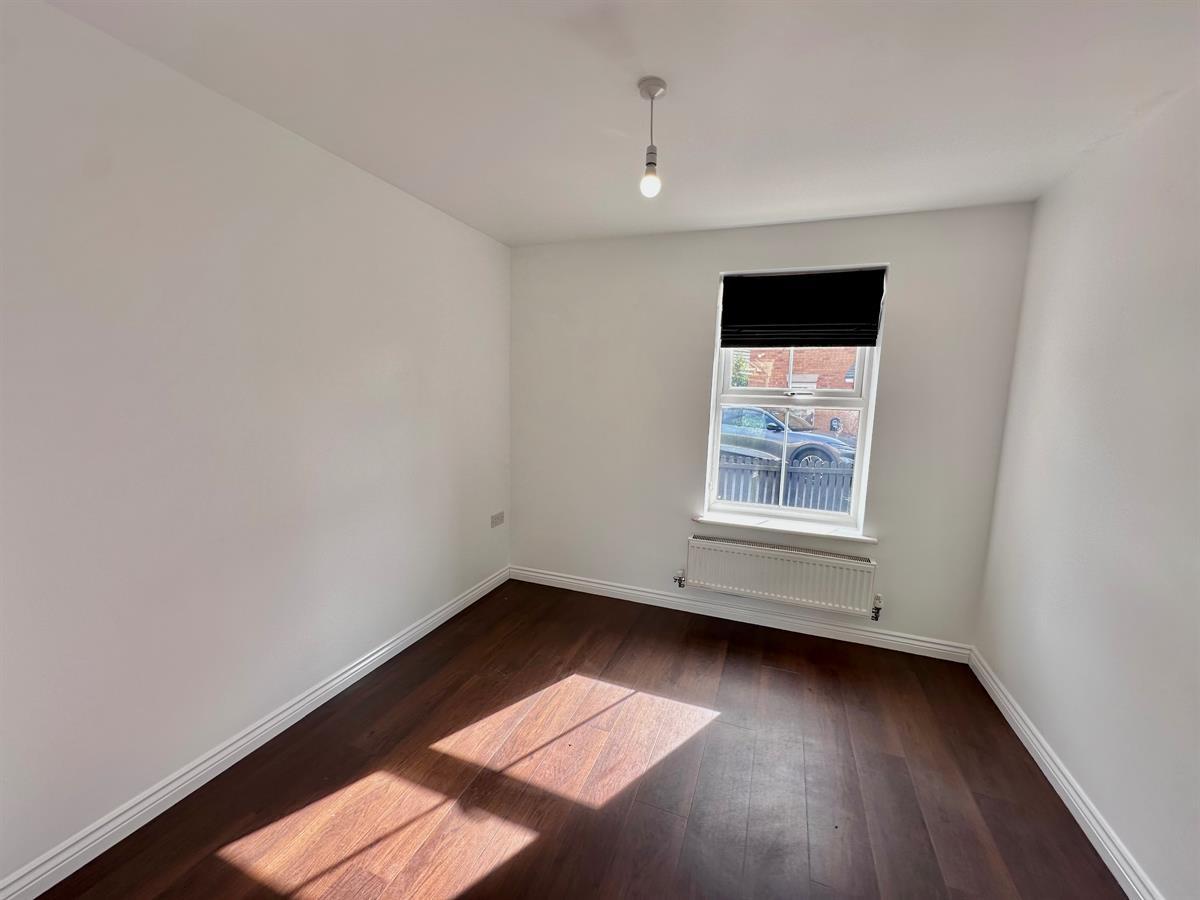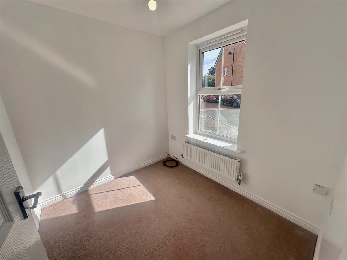 Beige carpet, white painted ceiling, white door, white skirting boards, white walls, white hanging bulb fitting, 2 double sockets, white radiator, open reach socket, no curtain pole above window.