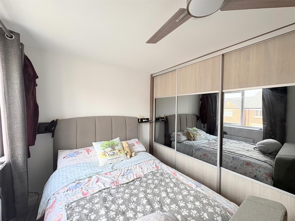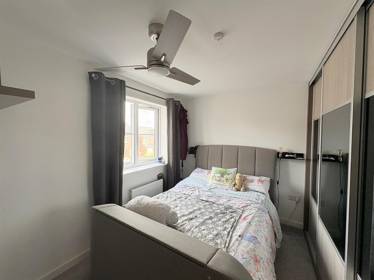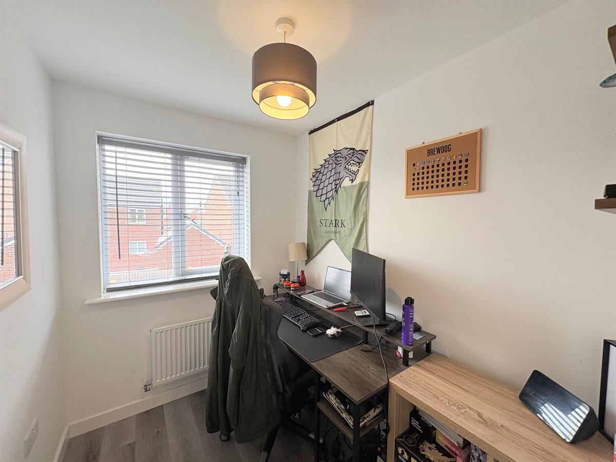 White door with silver handle upon entry, light grey carpet flooring, white skirting boards, white walls, two dual plug sockets, one white radiator, one window overlooking rear.