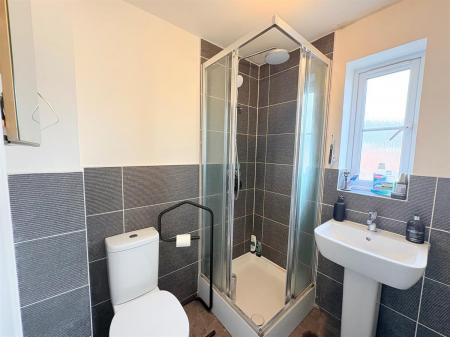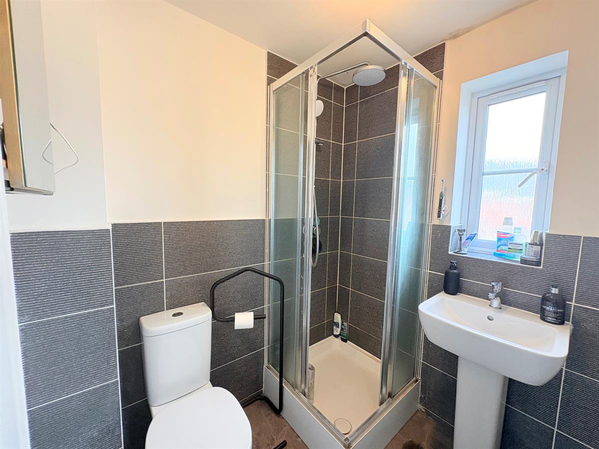 White door with silver handle upon entry, light grey tiled flooring, white skirting boards, white walls, dark grey tiling surrounding appliances, one frosted window overlooking front, white shower with clear screen and silver showerhead unit, white sink with silver tap, white toilet.
