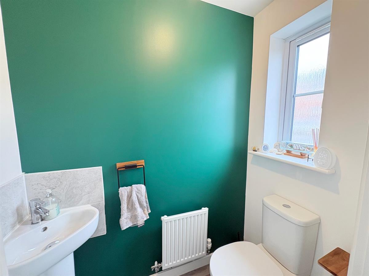 Downstairs WC with a white door with a silver handle upon entry, light grey plank flooring, white skirting boards, white sink with silver tap, white toilet, one white radiator, one frosted window overlooking front.