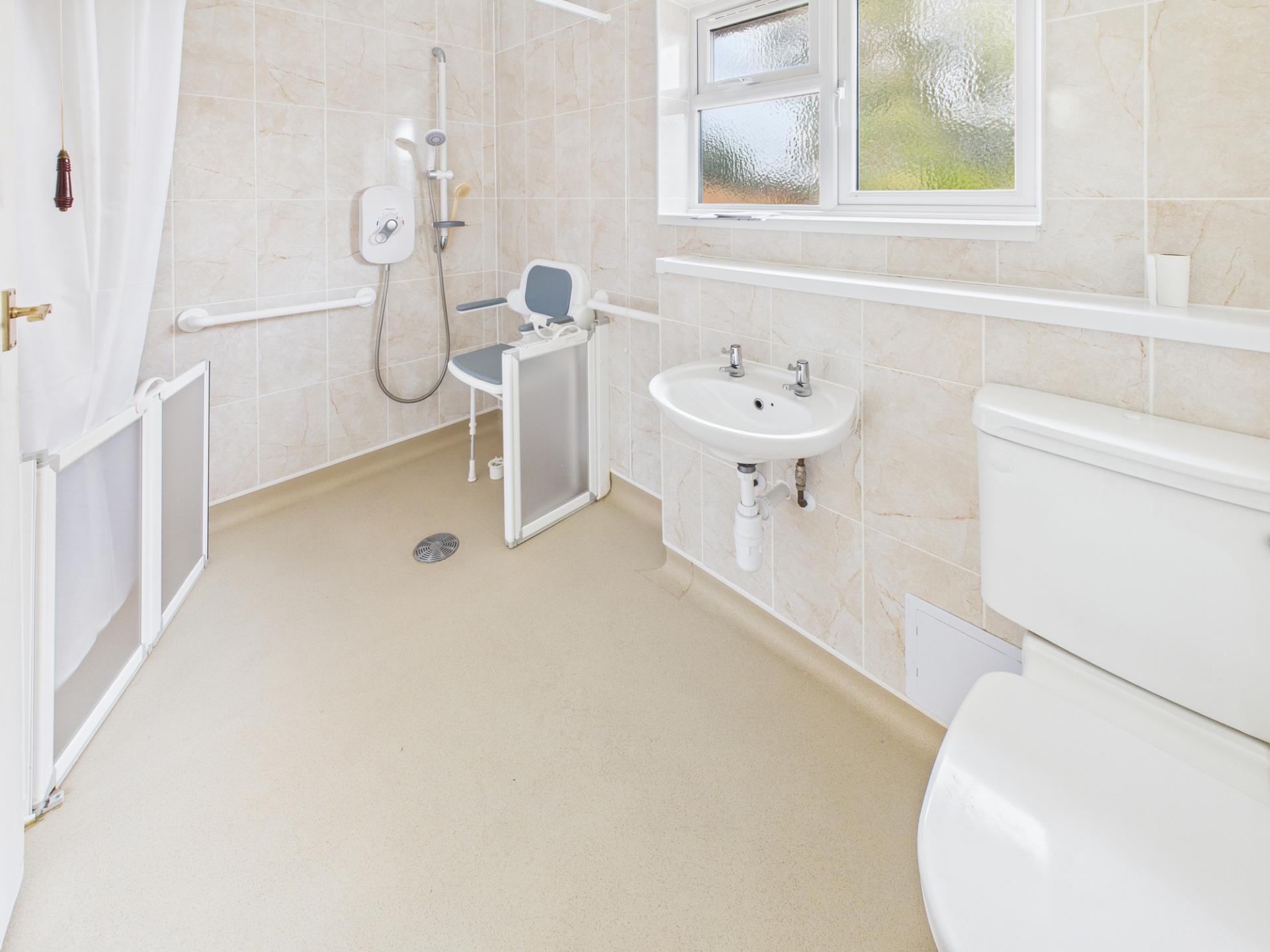 WET ROOM/WC Shower area with screen and half height door. Electric shower. Wash hand basin. Low level WC. Tiled behind fitments. Wet room flooring.