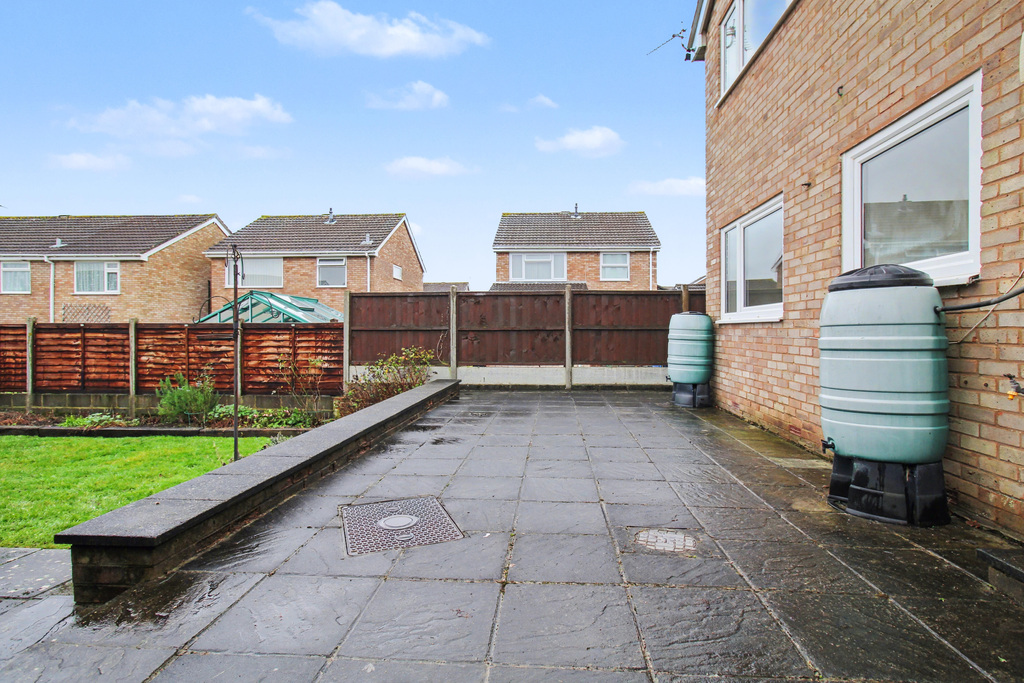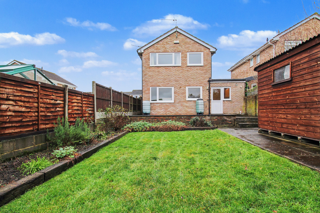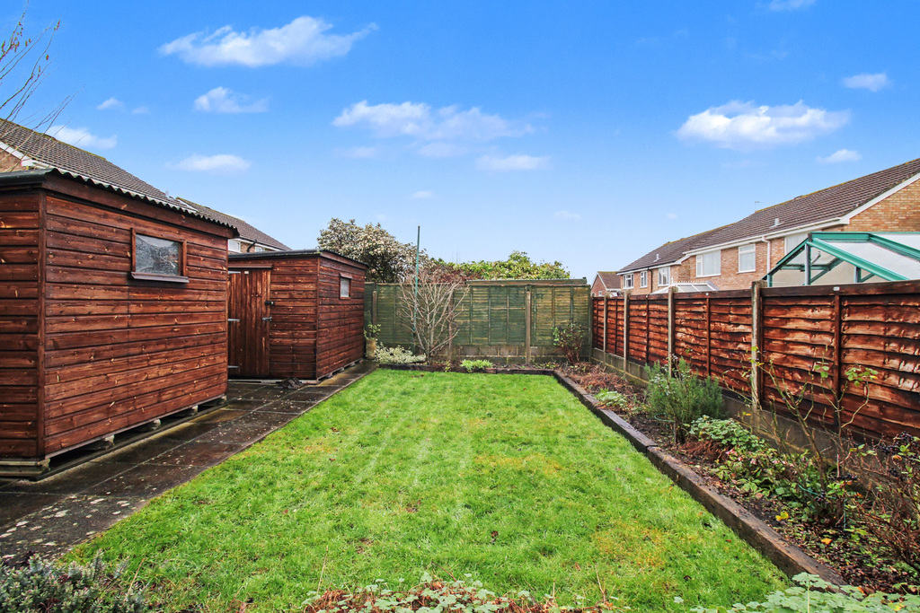 - Enclosed rear garden featuring a generous patio, an area of lawn bordered by shrub-filled beds, and a garden shed providing useful storage.