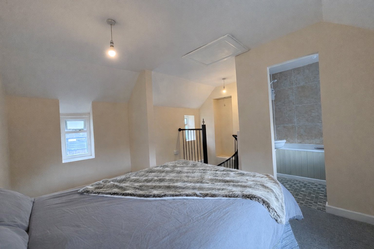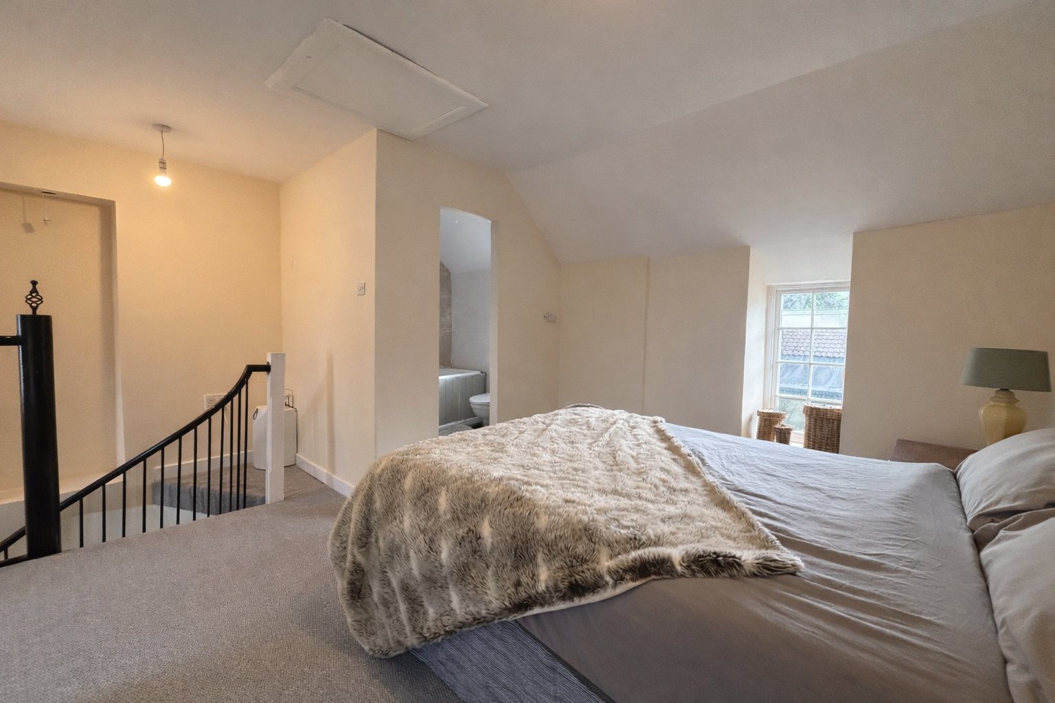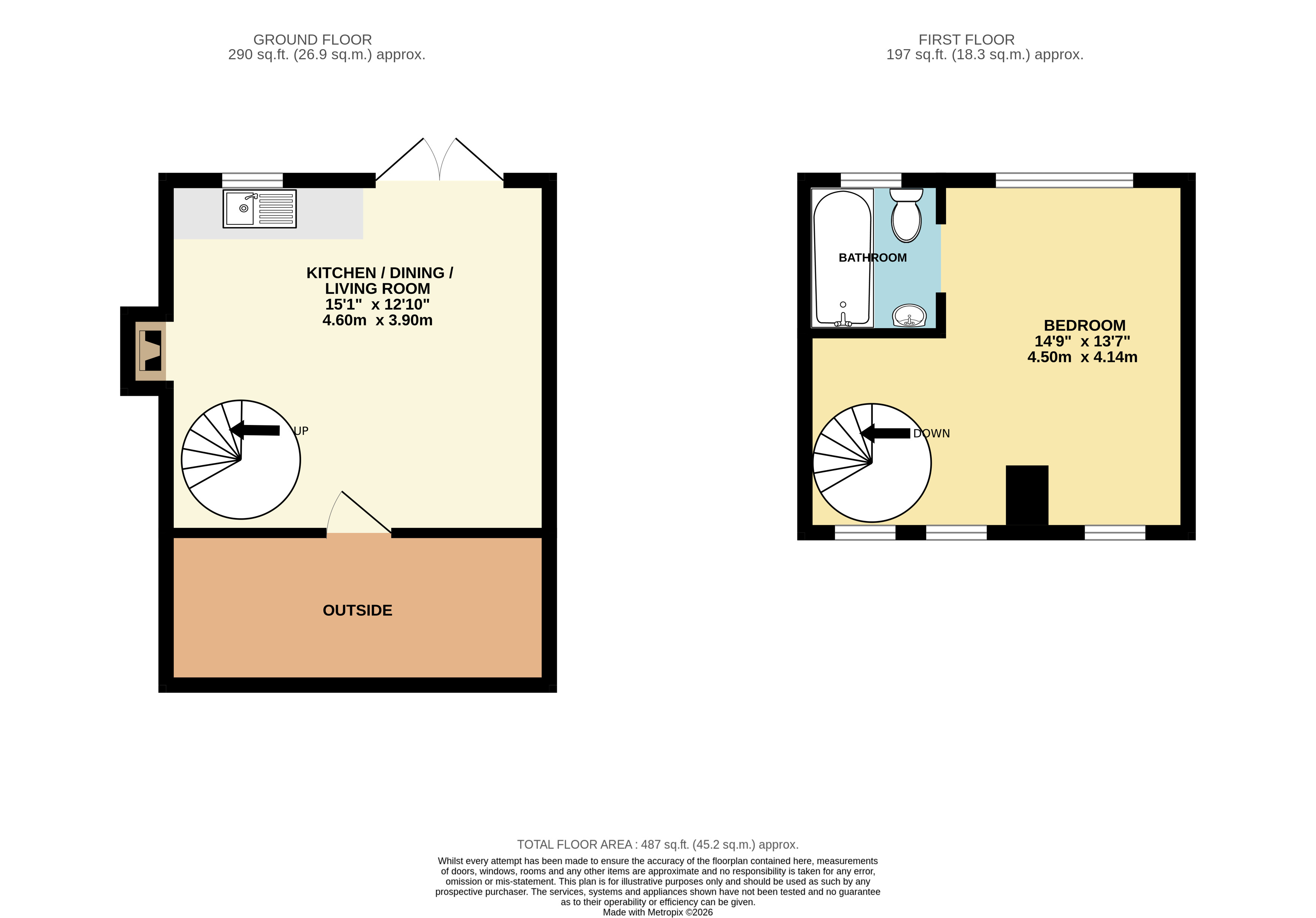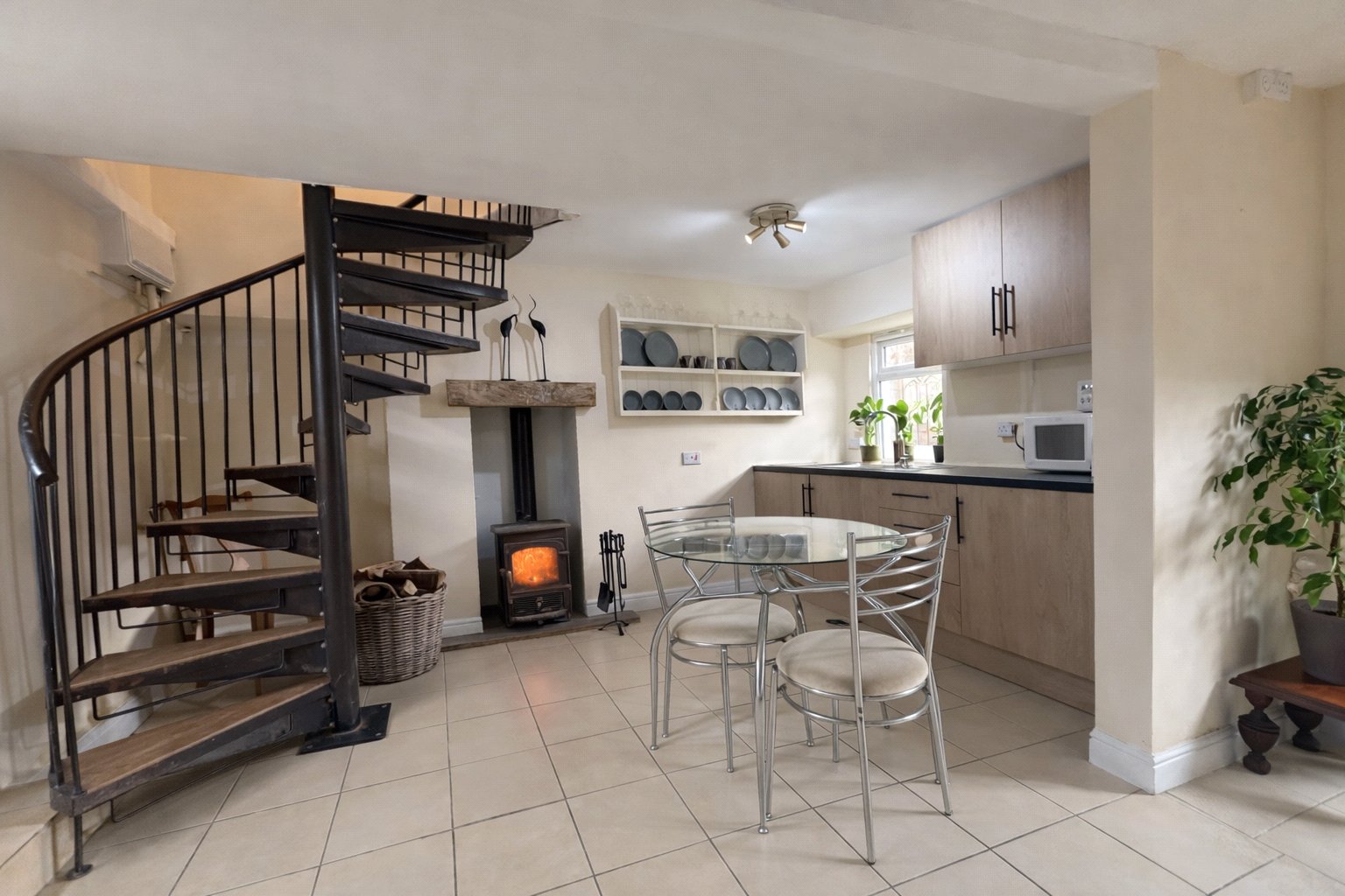 A spiral staircase adds character and a sense of individuality, leading to the first floor where the bedroom provides a comfortable and private space away from the main living area and an area at the top of the stairs that could be used as a home office. The first floor bathroom supports the bedroom accommodation, completing a layout that is both practical and easy to enjoy.