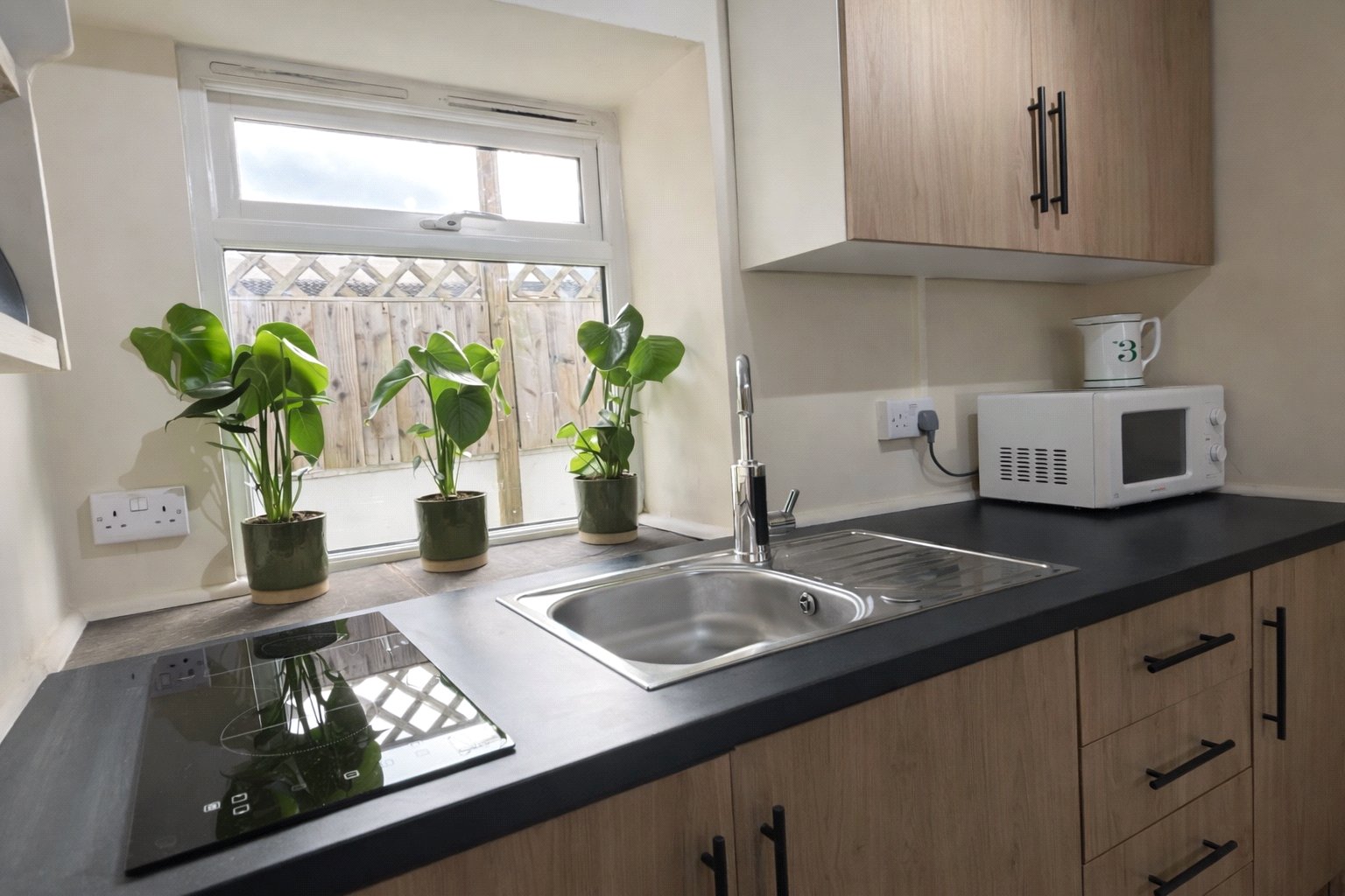 At the heart of the home sits a very impressive open plan kitchen, with integrated washer/dryer, fridge and worksurface over with inset induction hob, sitting and dining room, designed as a single sociable space that still allows clear areas for cooking, relaxing and dining. The woodburner brings a cosy focal point to the room and enhances the cottage feel, creating a space that lends itself to quieter evenings as well as entertaining. French doors open directly to the rear patio area, extending the living space outside and providing a natural spot for morning coffee or a low maintenance outdoor retreat.