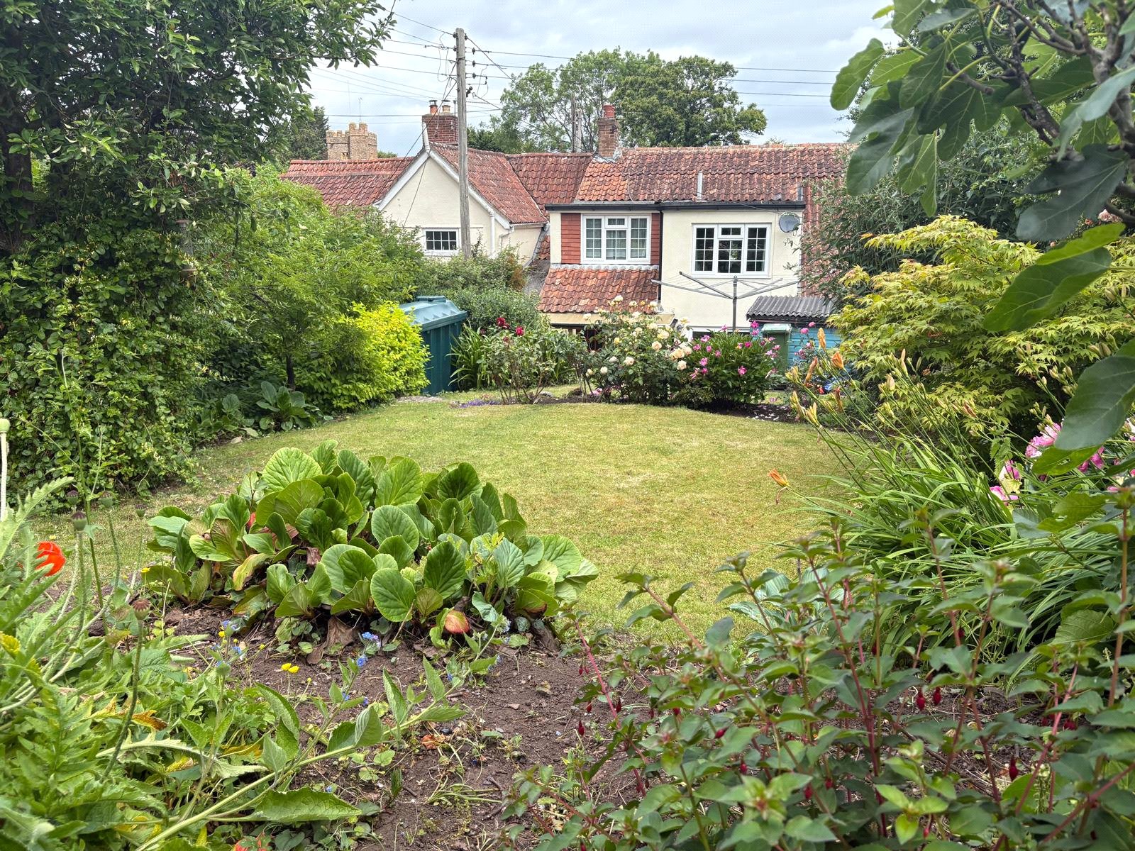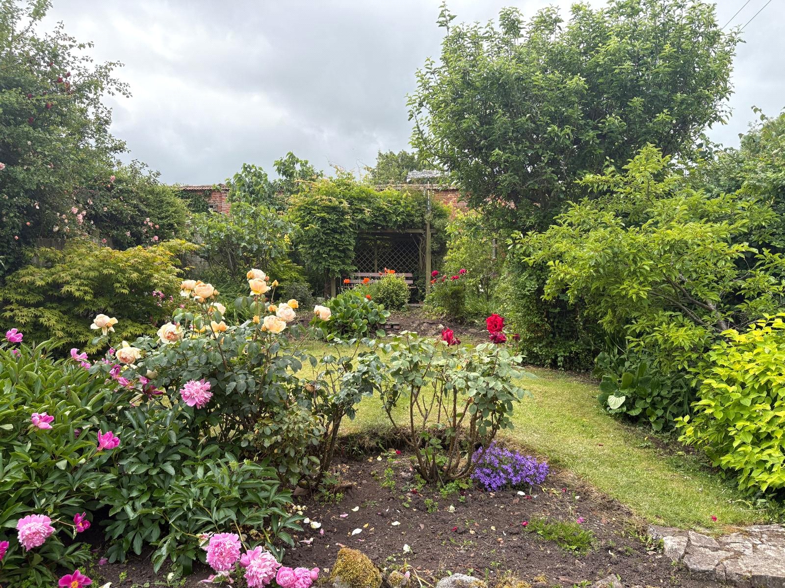 The mature country style garden features two inviting seating areas, mature flower beds, seasonal planting, and a well-maintained lawn ideal for entertaining or enjoying peaceful outdoor moments. parking is on the road.