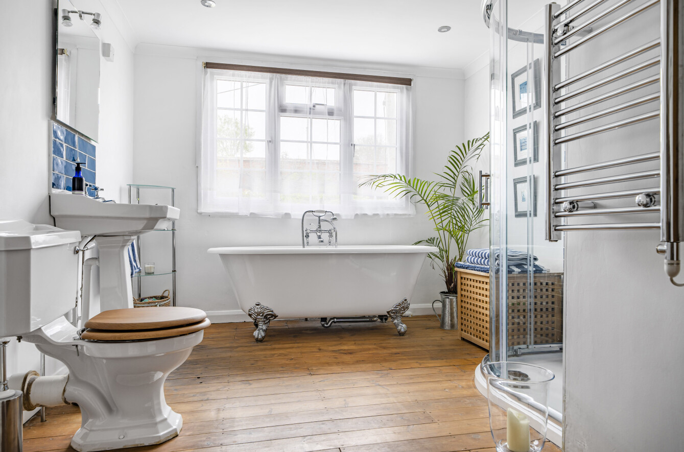 The first floor offers three well-proportioned double bedrooms, including one that overlooks the garden. The bathroom is a standout feature, recently updated with a contemporary roll-top bath, separate walk-in shower, and WC all set in an impressively spacious layout.