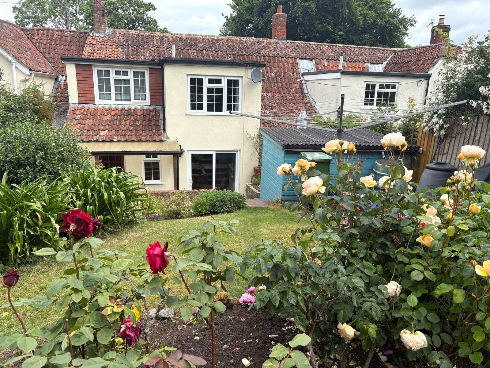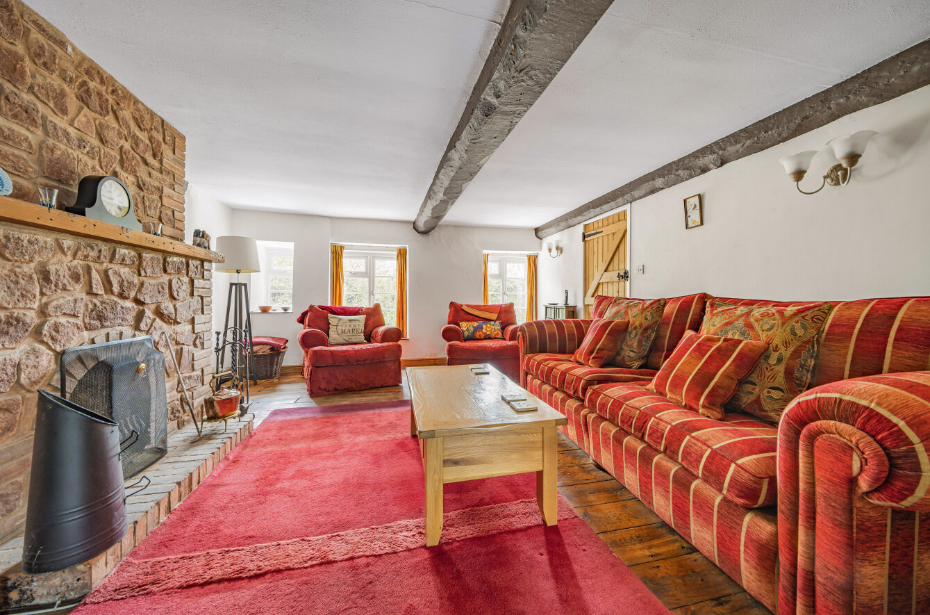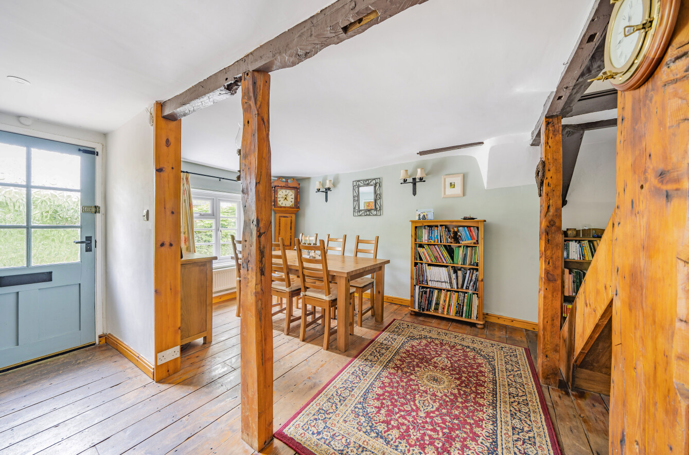 The interior of the home is full of character, with exposed timber beams, wooden flooring, and original features throughout. The entrance leads into a charming open-plan hallway and dining area with beautiful beams and stairs to the first floor. The cosy sitting room features an open fireplace with stone surround, perfect for relaxing evenings.