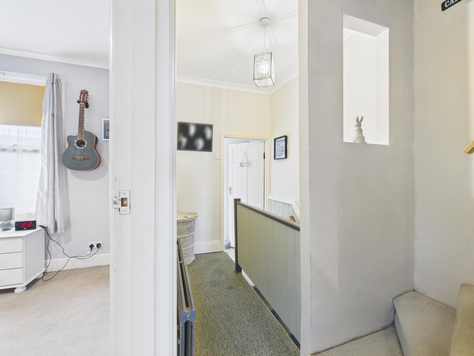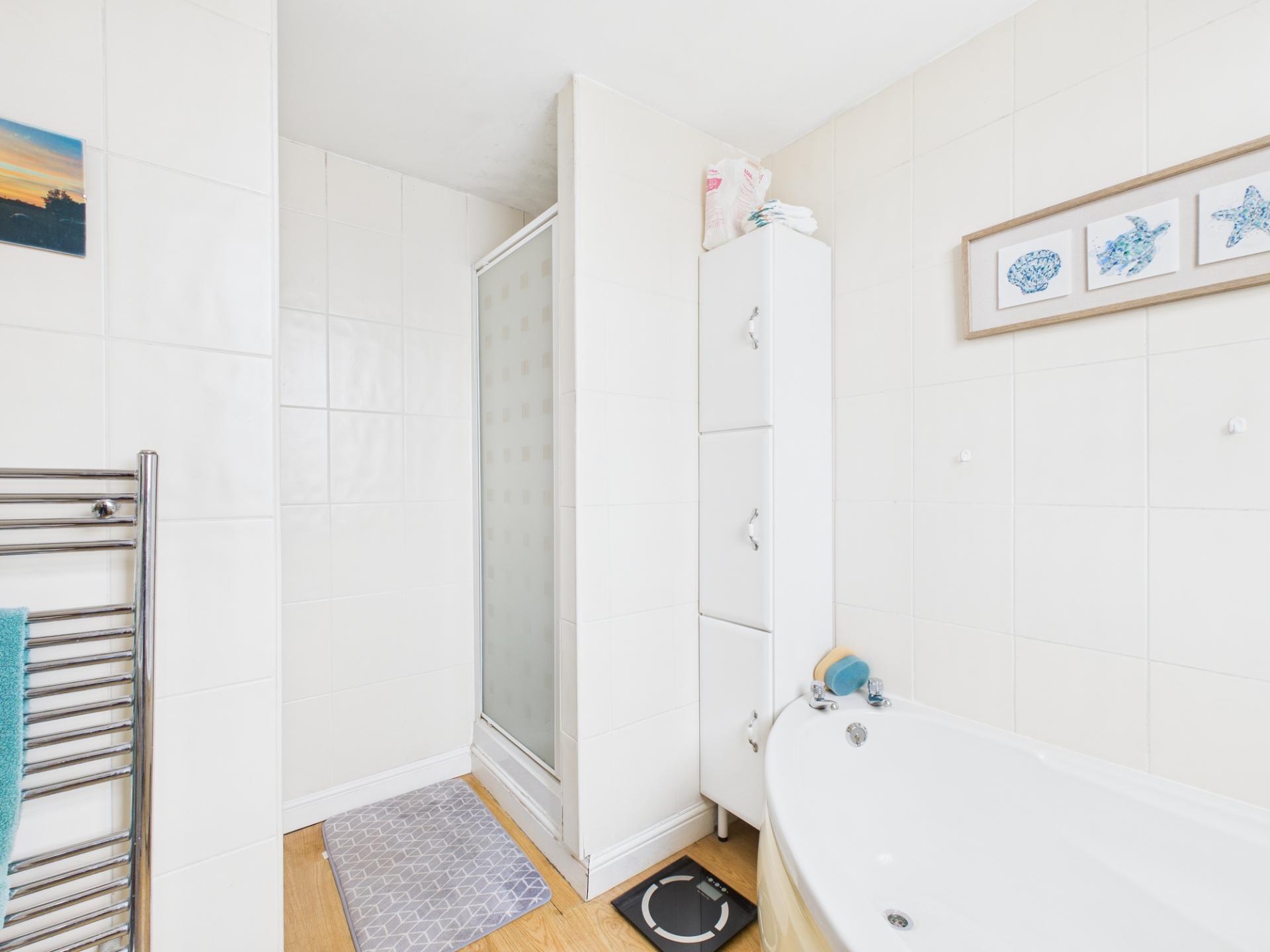 To the first floor are the two bedrooms and good size bathroom, with corner bath and separate shower enclosure.