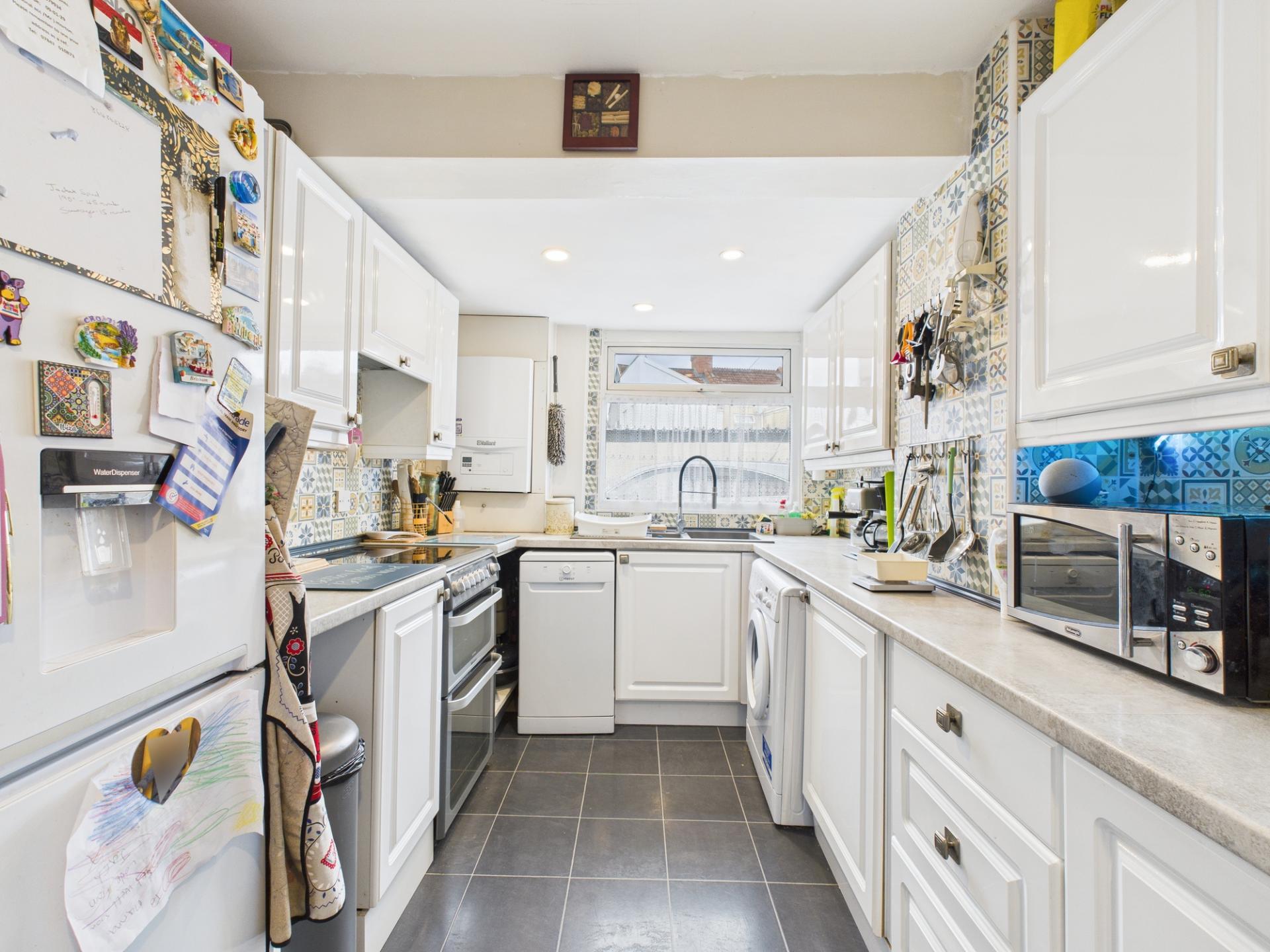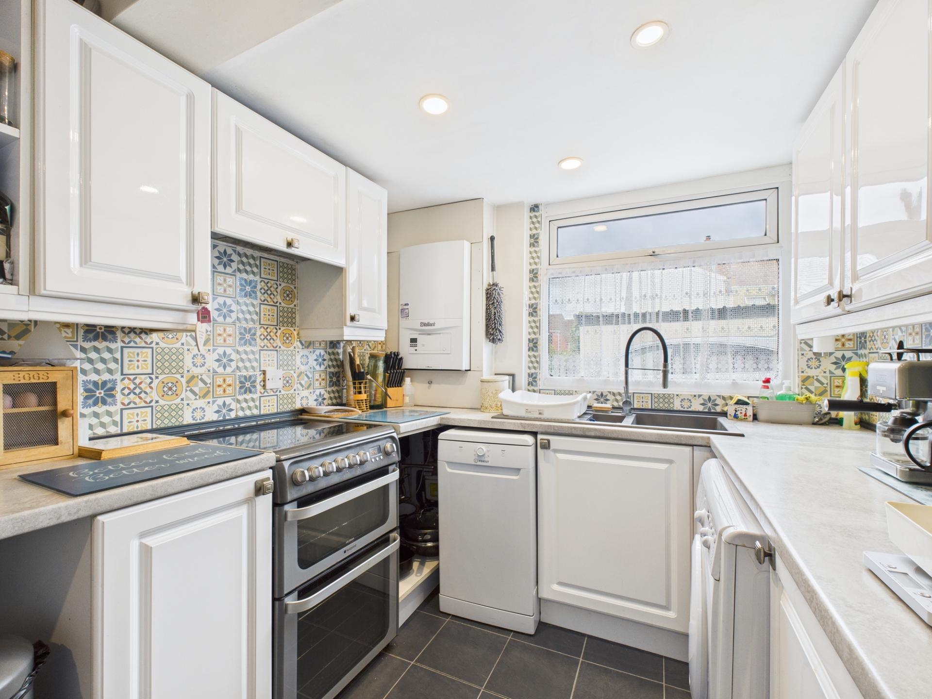 KITCHEN 14'8" x 7'9" (4.47m x 2.37m). Double glazed window to the rear aspect, radiator and space for cooker, washing machine, dish washer, tall fridge/freezer and 'Vaillant' gas boiler.