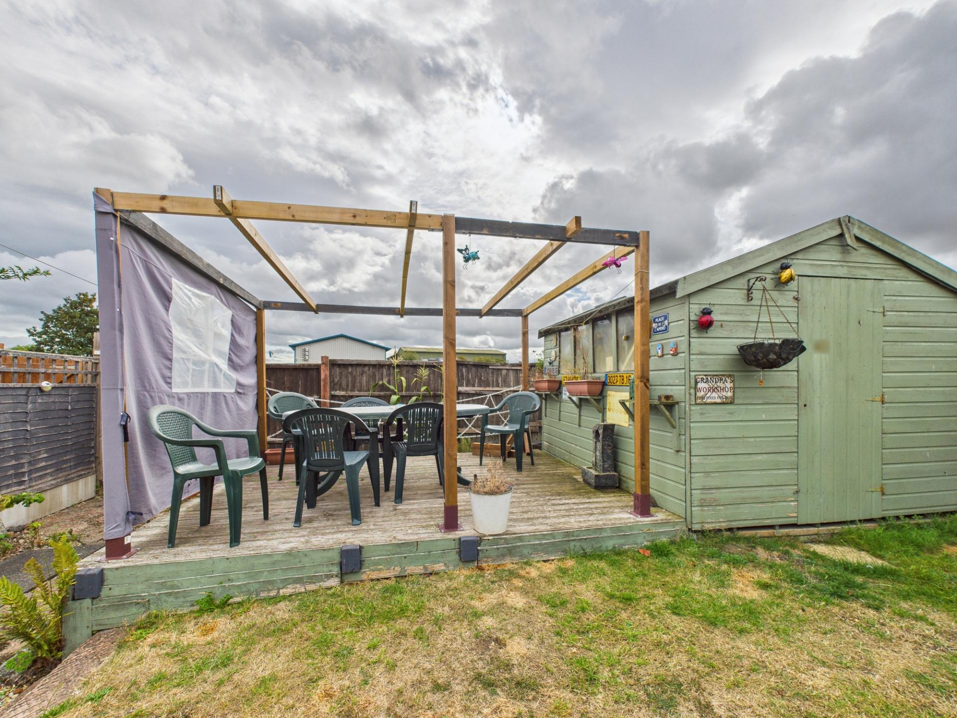 OUTSIDE. The main garden which sits to the front of this particular property, is east facing and has a decking area at one end to catch the evening sun. It is also fully enclosed with gate through the front and river side boundary.