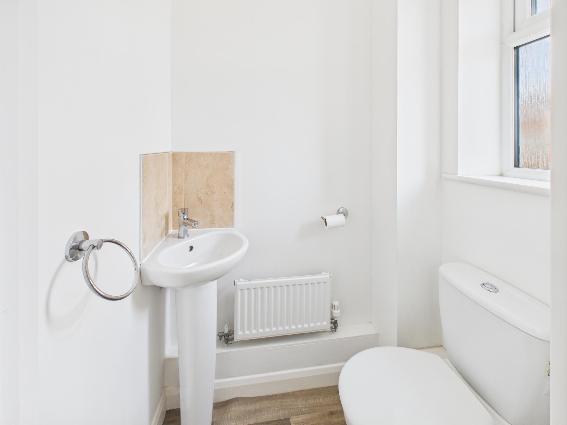 CLOAKROOM Pedestal wash basin. Low level WC Radiator.