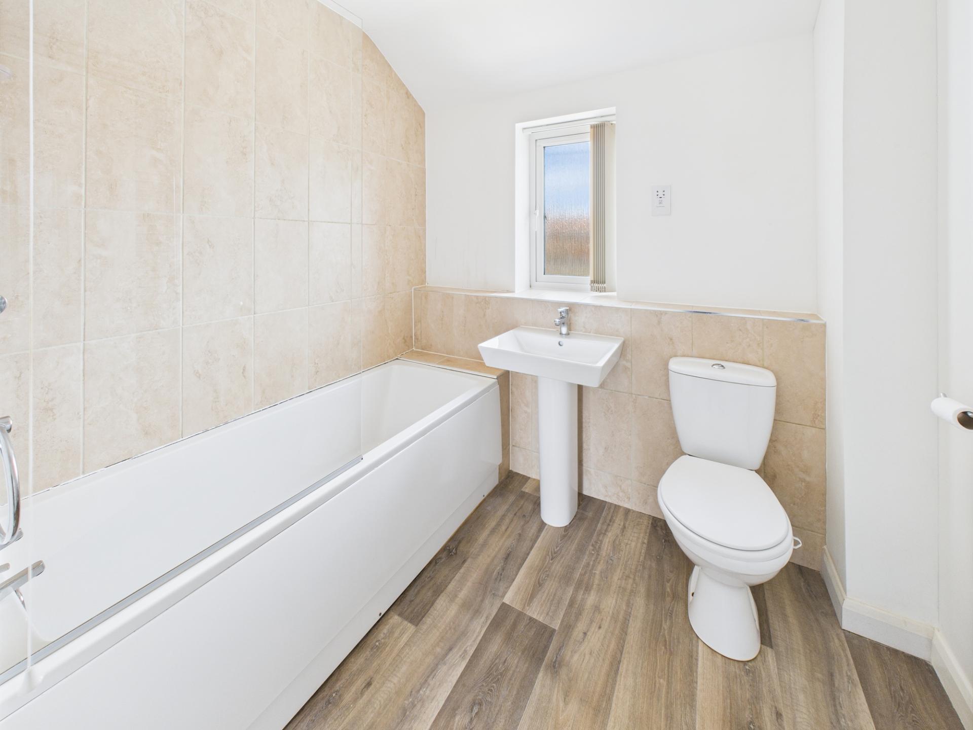 BATHROOM Panelled bath with mains shower over, fully tiled around and screen. Pedestal wash basin. Low level WC. Chrome radiator/towel rail. Shaver point. Flooring.