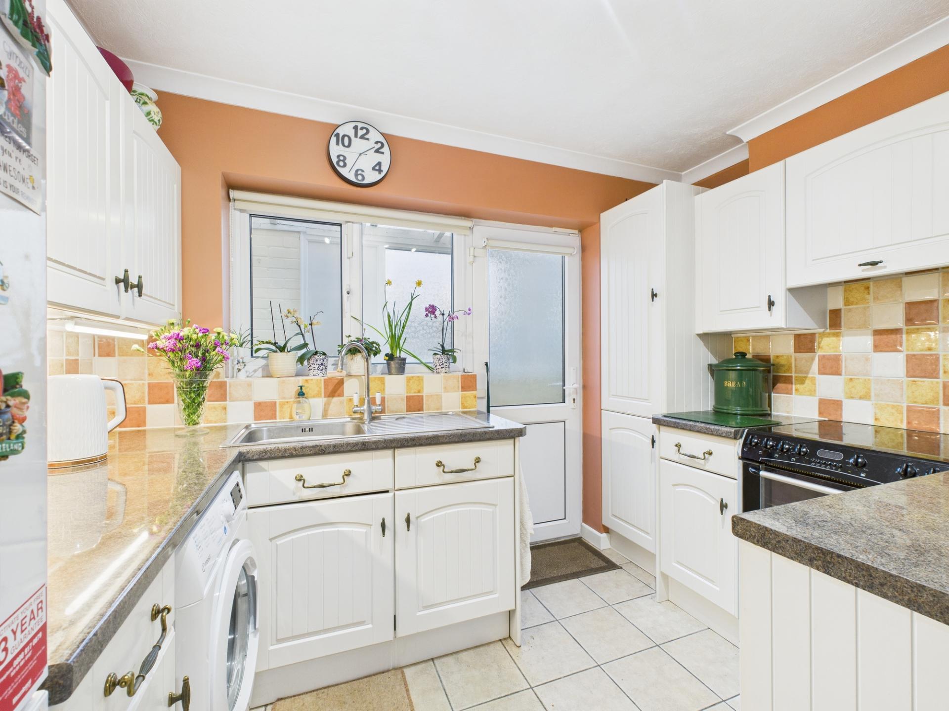 KITCHEN 9’9” x 7’2” (2.99m x 2.20m) With inset sink/drainer, rolled top working surfaces with further cupboards & drawers under and matching wall cupboards over, space and plumbing for washing machine, space for free standing oven and a fridge/freezer. UPVC double glazed door and window to covered walkway between bungalow and garage.