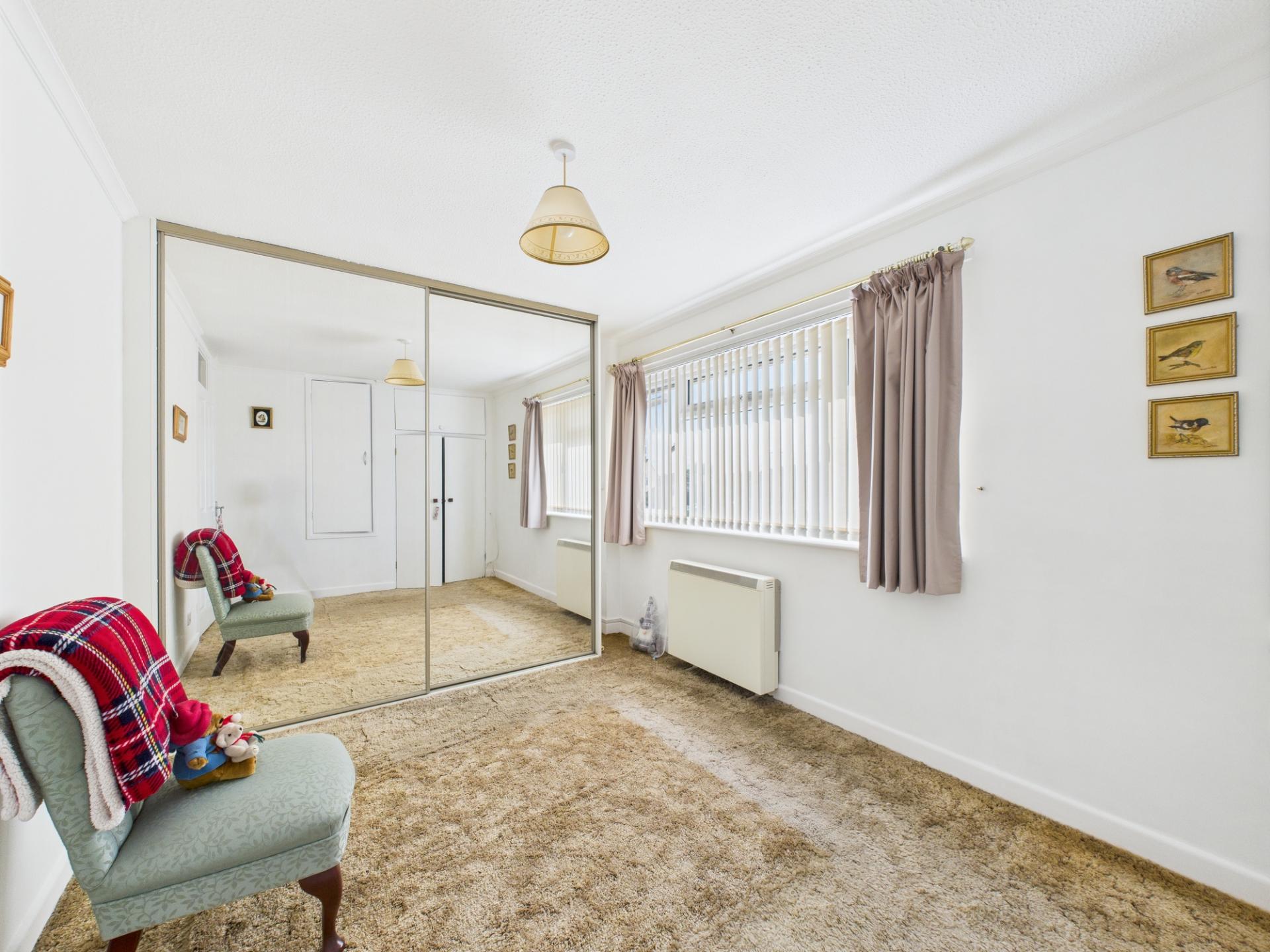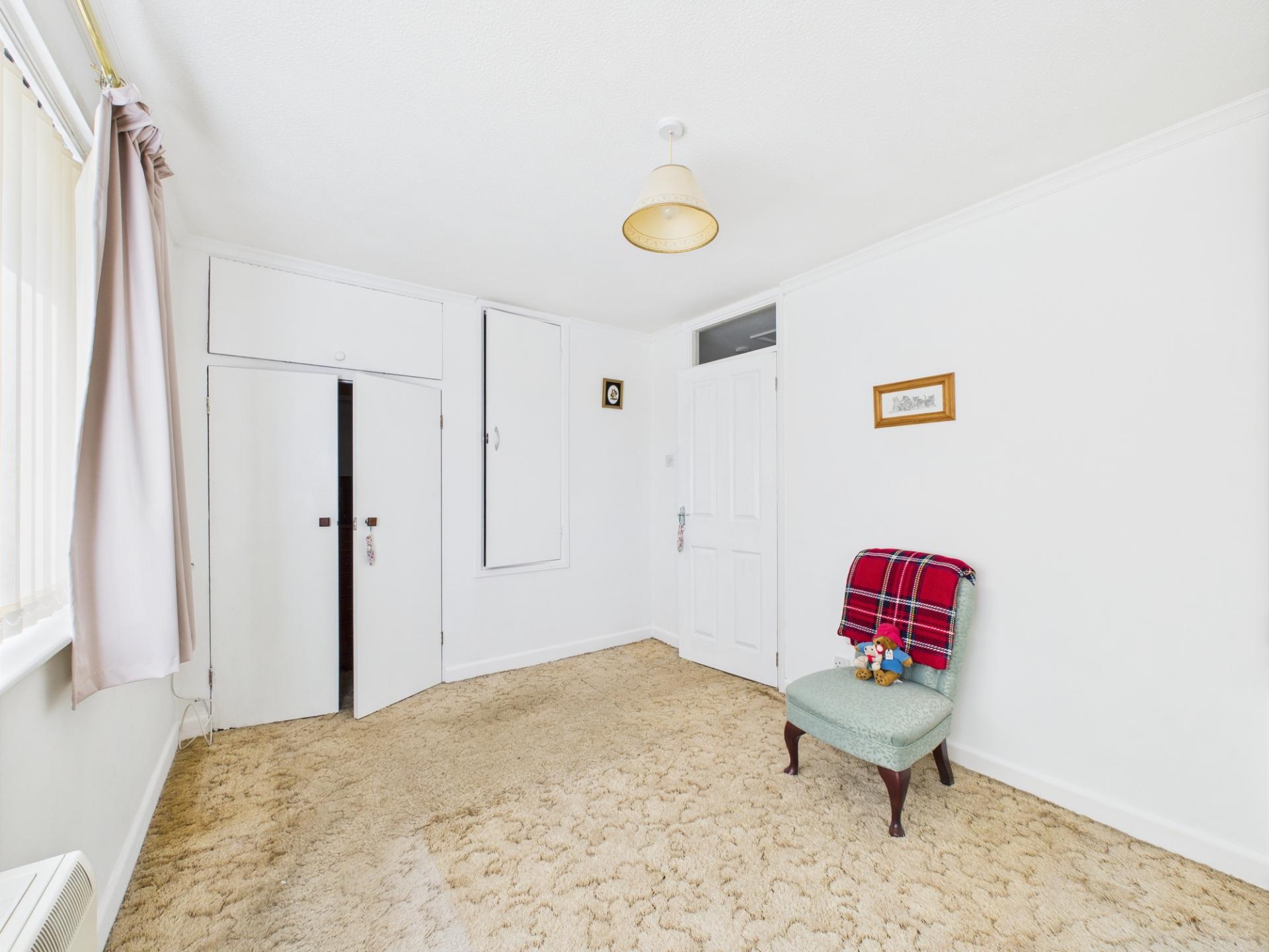 BEDROOM 1 12’10” x 9’1” (3.91m x 2.77m) Night storage heater. Built-in cupboard over stairwell and wardrobes.