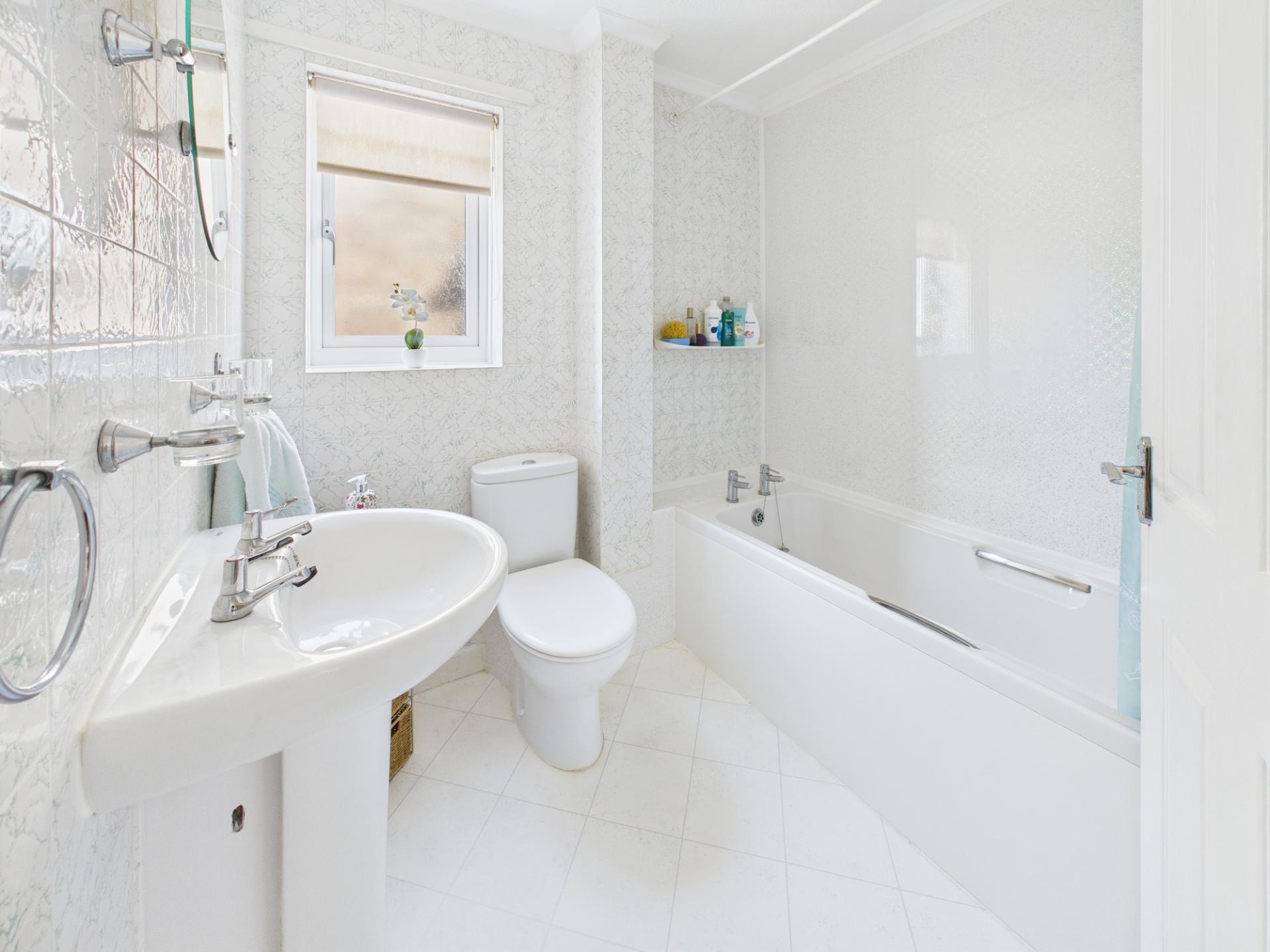 BATHROOM Panel bath with shower over (not working). Pedestal wash hand basin. Low level WC. Shaver point. Double glazed window.