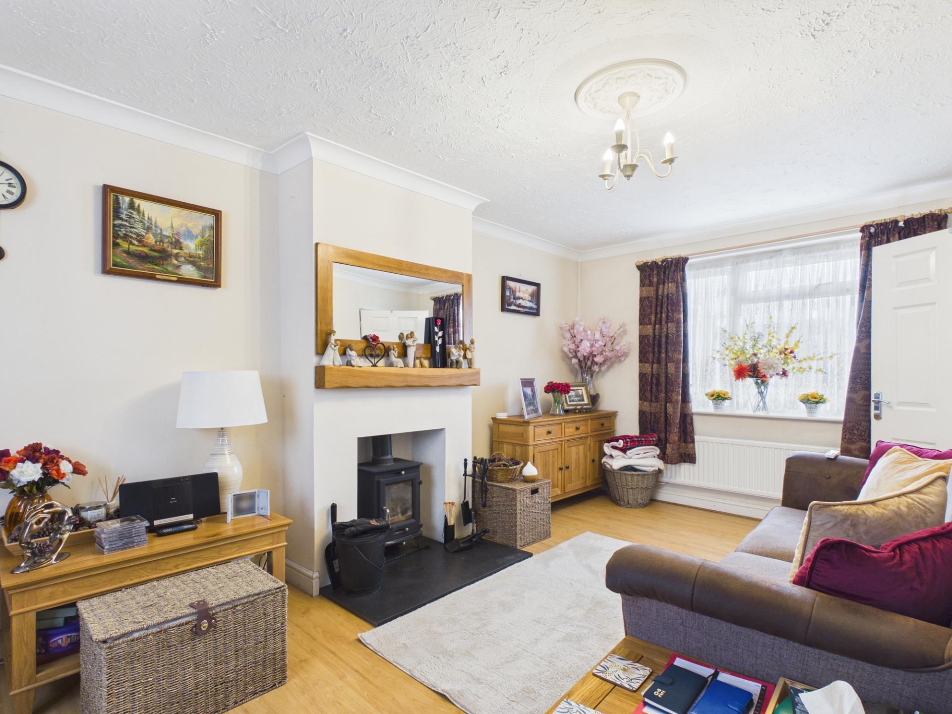 LOUNGE 18’5” x 10’3” max. (5.62m x 3.14m max.) Feature multi fuel fire with timber mantle over and slate hearth. 2 radiators. TV aerial point. Dual aspect double glazed windows. Laminate flooring. Understairs cupboard.