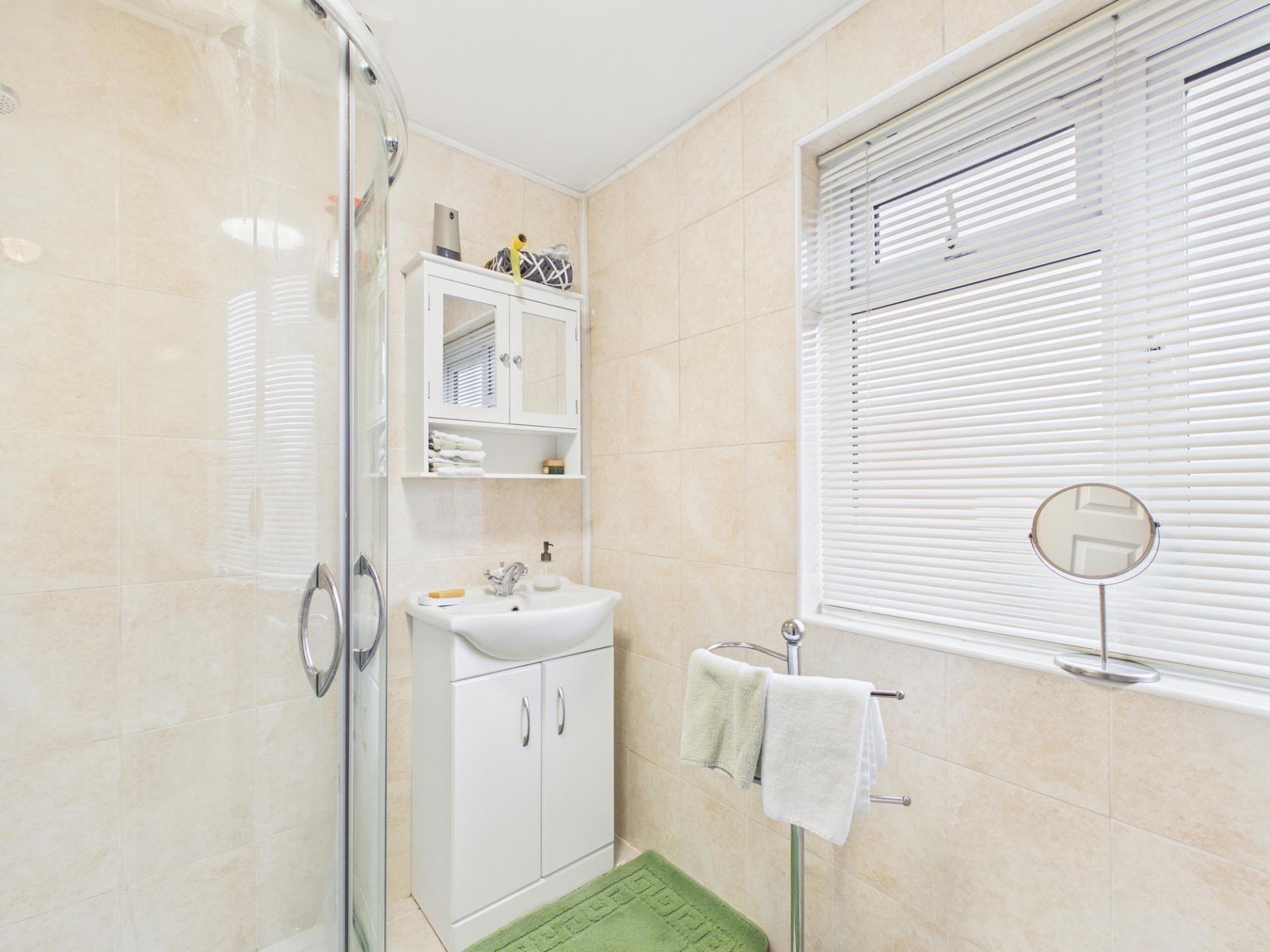 SHOWER ROOM Shower cubicle with electric shower unit and glazed screen with sliding doors. Wash hand basin. Low level WC. Radiator/heated towel rail. Double glazed window.