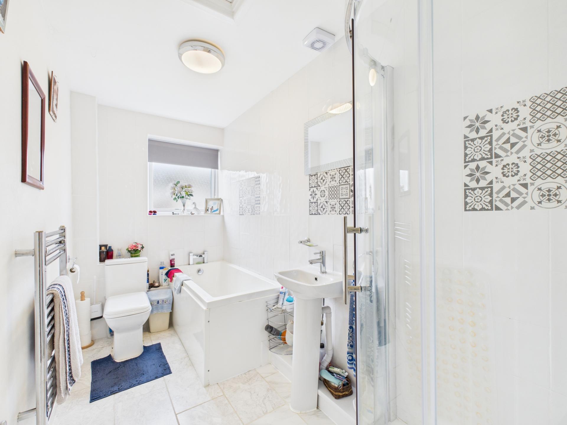 BATHROOM Bath with mixer tap, separate corner shower unit with fitted mains shower, WC, wash basin and UPVC double glazed window.