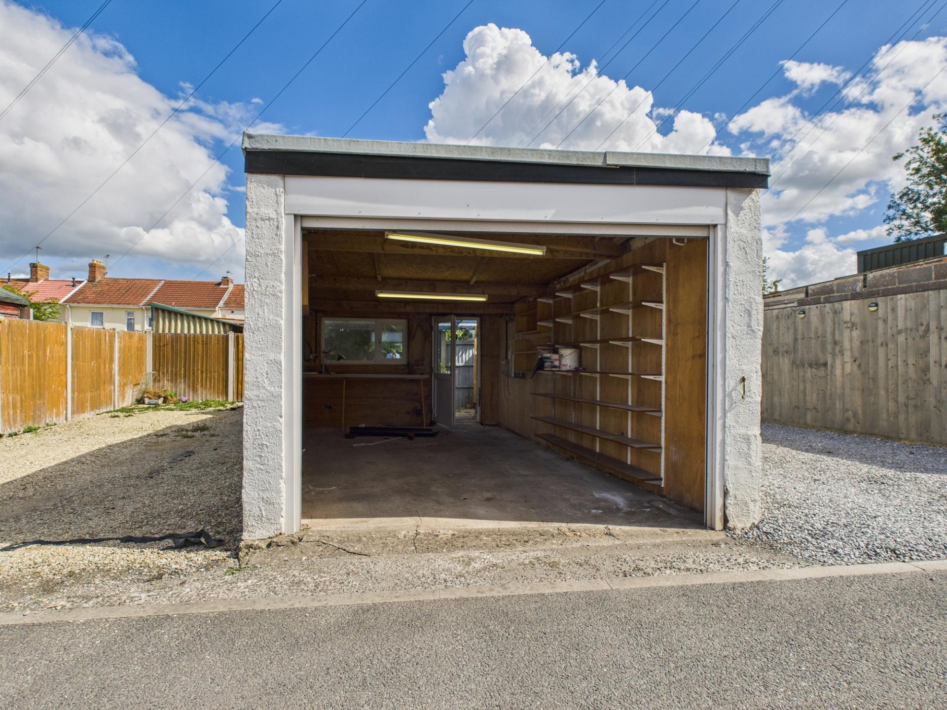 Outside there is a good size and south west facing garden that leads to the garage at the rear. The garage has power, light and electric roller door that opens out onto an area that is nicely tarmacked and has enough turning space if one wanted to use the garage for parking.