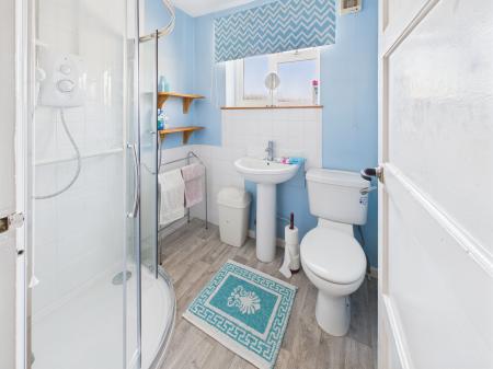 SHOWER ROOM/WC Corner shower cubicle with inset Mira shower. Pedestal wash hand basin. Low level WC. Radiator. Extractor.