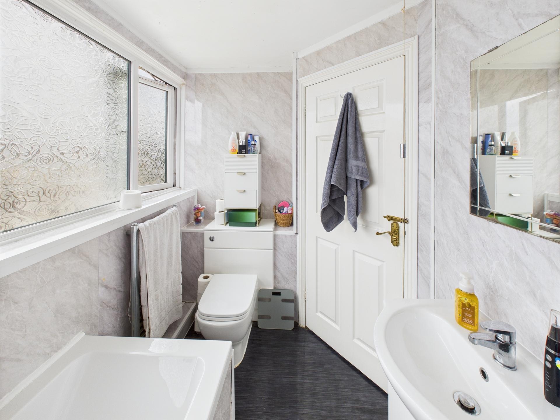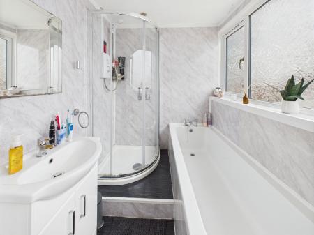BATHROOM With panelled bath step up to raised corner shower tray, curved shower, screen doors, wall mounted electric shower, vanity basin with cupboards under. Low level WC. Towel rail/Radiator, Vinolay floor covering.