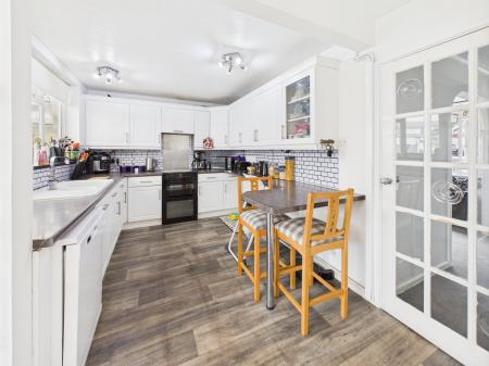 KITCHEN/BREAKFAST ROOM 11’01” x 8’5” With inset enamel one and a quarter bowl single drainer sink unit with cupboards and drawers under deep rolled top working surfaces to further three walls extending to breakfast bar area comprehensive and complementary range of matching wall cupboards over, Radiator, Vinolay floor covering, door to