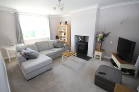 SITTING ROOM 16’4” x 12’0” Chimney breast with inset woodburner. Radiator. Dual aspect UPVC double glazed windows. Coving.