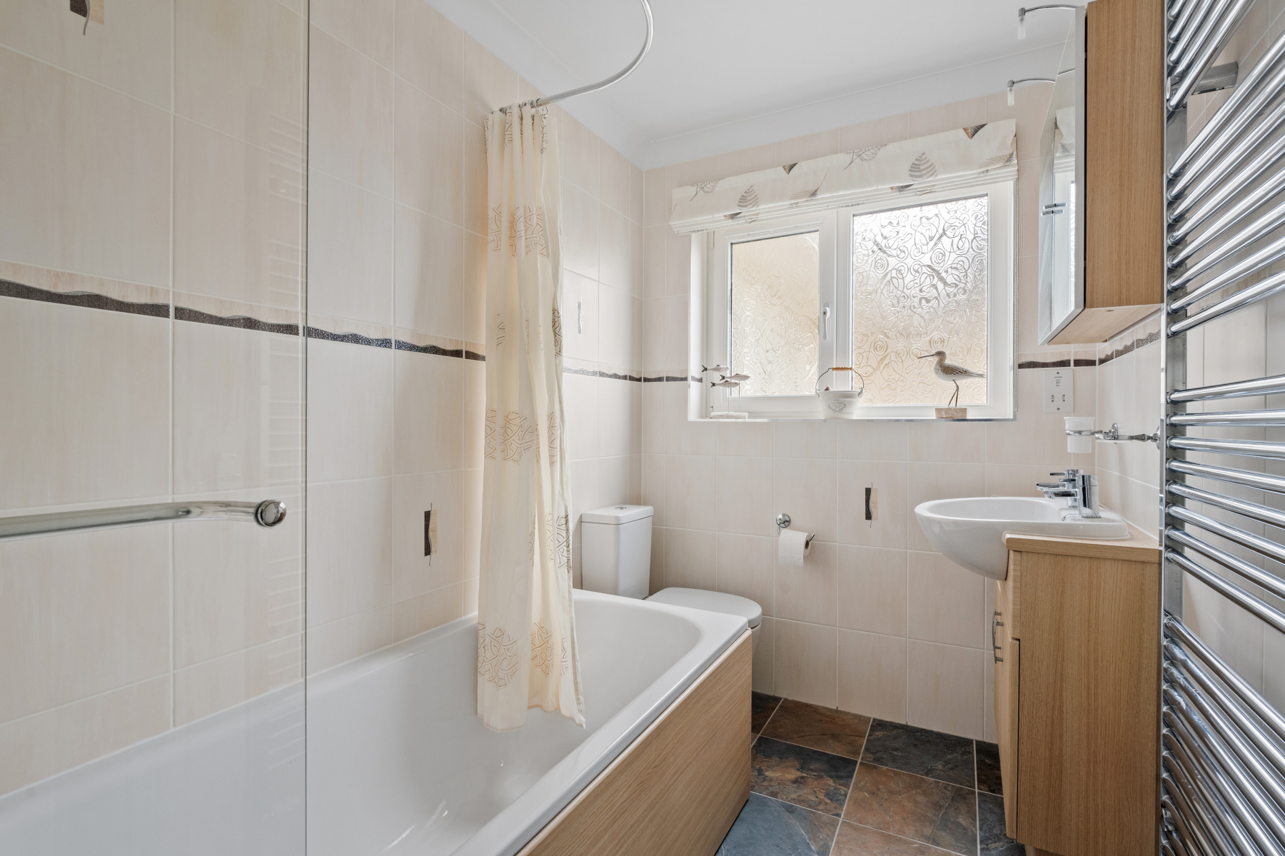 The FAMILY BATHROOM is neatly presented and fully tiled, offering a bath with shower over, W.C., vanity sink, chrome heated towel rail, shaver point and side window for natural ventilation.