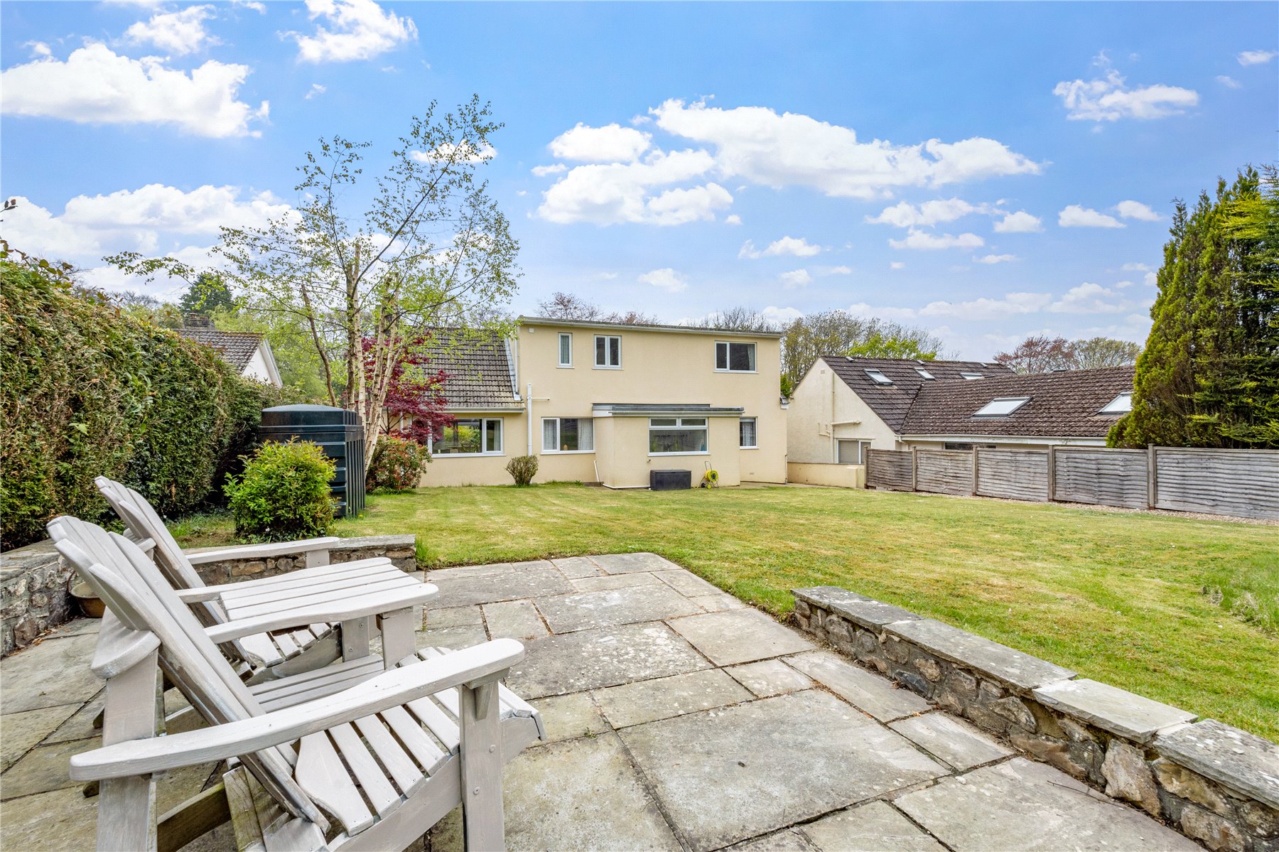 At the front, a wooded glade of Oak, Beech, Bay, Sumac, Gingko Biloba, Liquidambar, Clerodendron, Myrtle, Rowan, and winter-flowering Honeysuckle is interwoven with a private path revealing tantalising glimpses of the sea. To the rear, the south-facing garden is a haven of privacy and year-round interest, planted with an array of trees and shrubs. A broad lawn provides the perfect setting for family games and outdoor enjoyment, while a wooden shed offers practical storage for garden tools and equipment. A sheltered terrace, cloaked in Wisteria and flowing seamlessly from the principal reception room, creates the perfect stage for summer dining. These gardens are designed for colour, fragrance, and pure enjoyment at every turn.