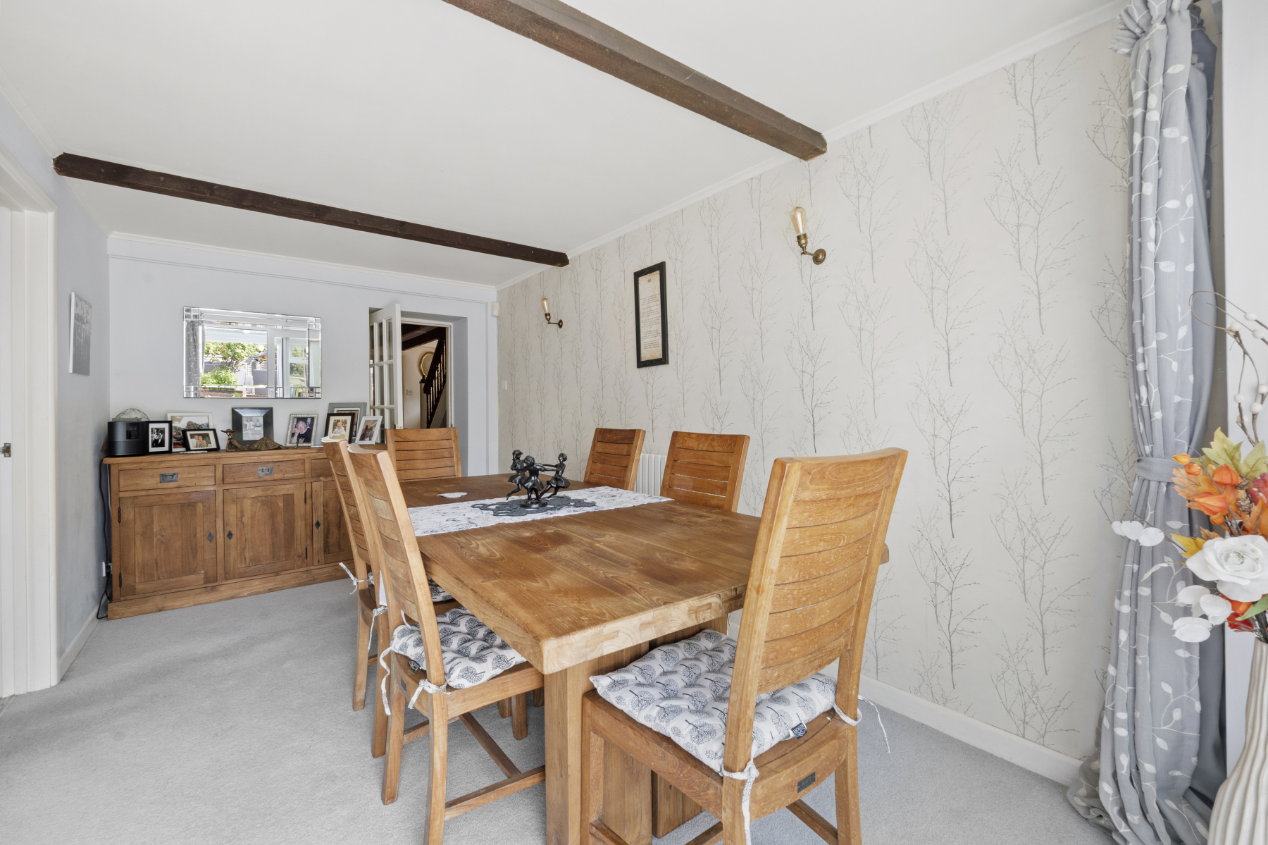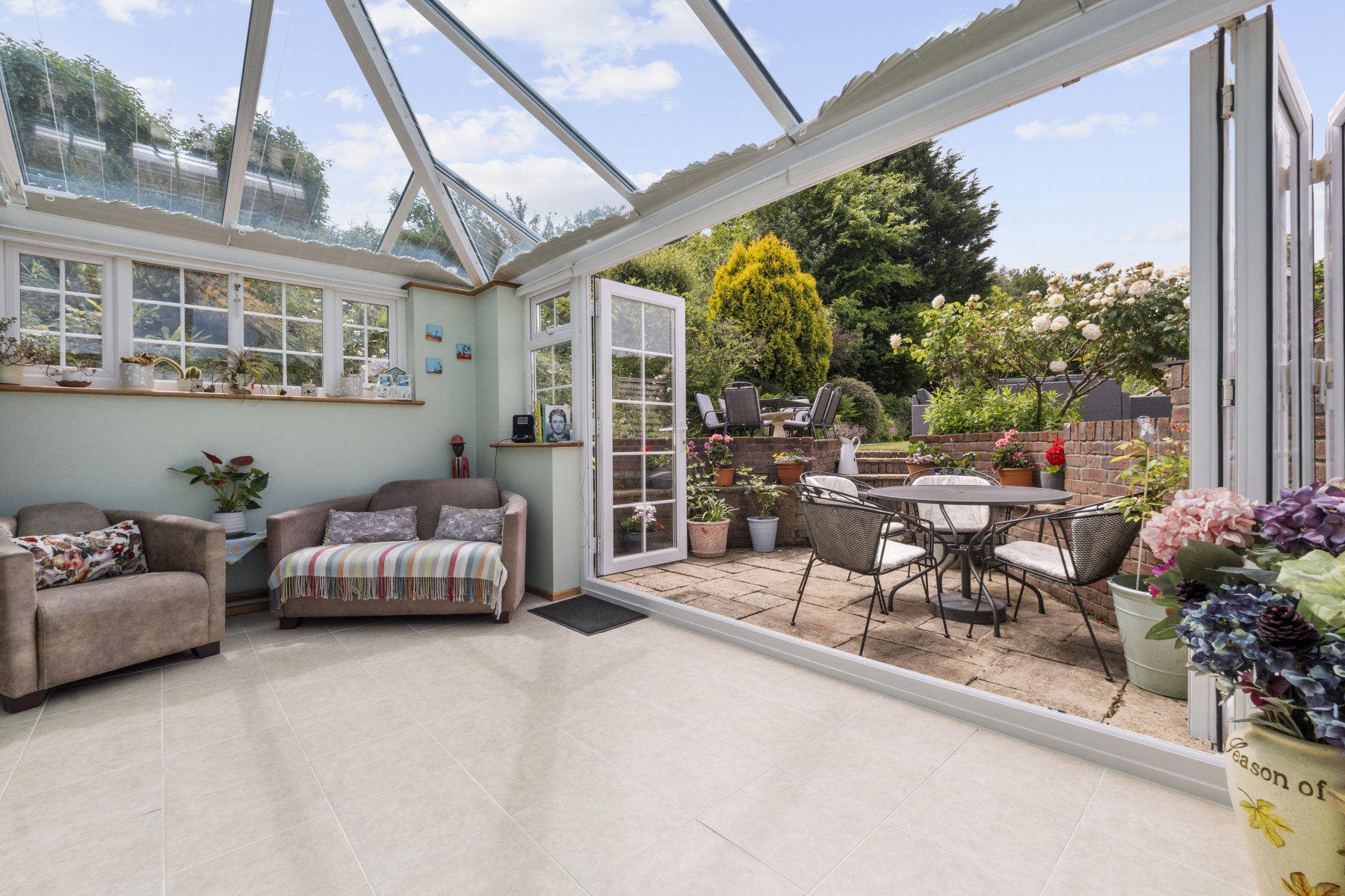 Designed with both comfort and entertaining in mind, the DINING ROOM is a charming gathering place with space for a generous family dining table, exposed beams above, and patio doors that open into the stunning CONSERVATORY. This light-filled extension features a glass roof, fitted blinds, tiled flooring, and underfloor heating. Triple-aspect windows and bi-fold doors bring the outside in, creating a seamless transition into the glorious gardens beyondperfect for summer soirees or simply unwinding in a sun-drenched corner.