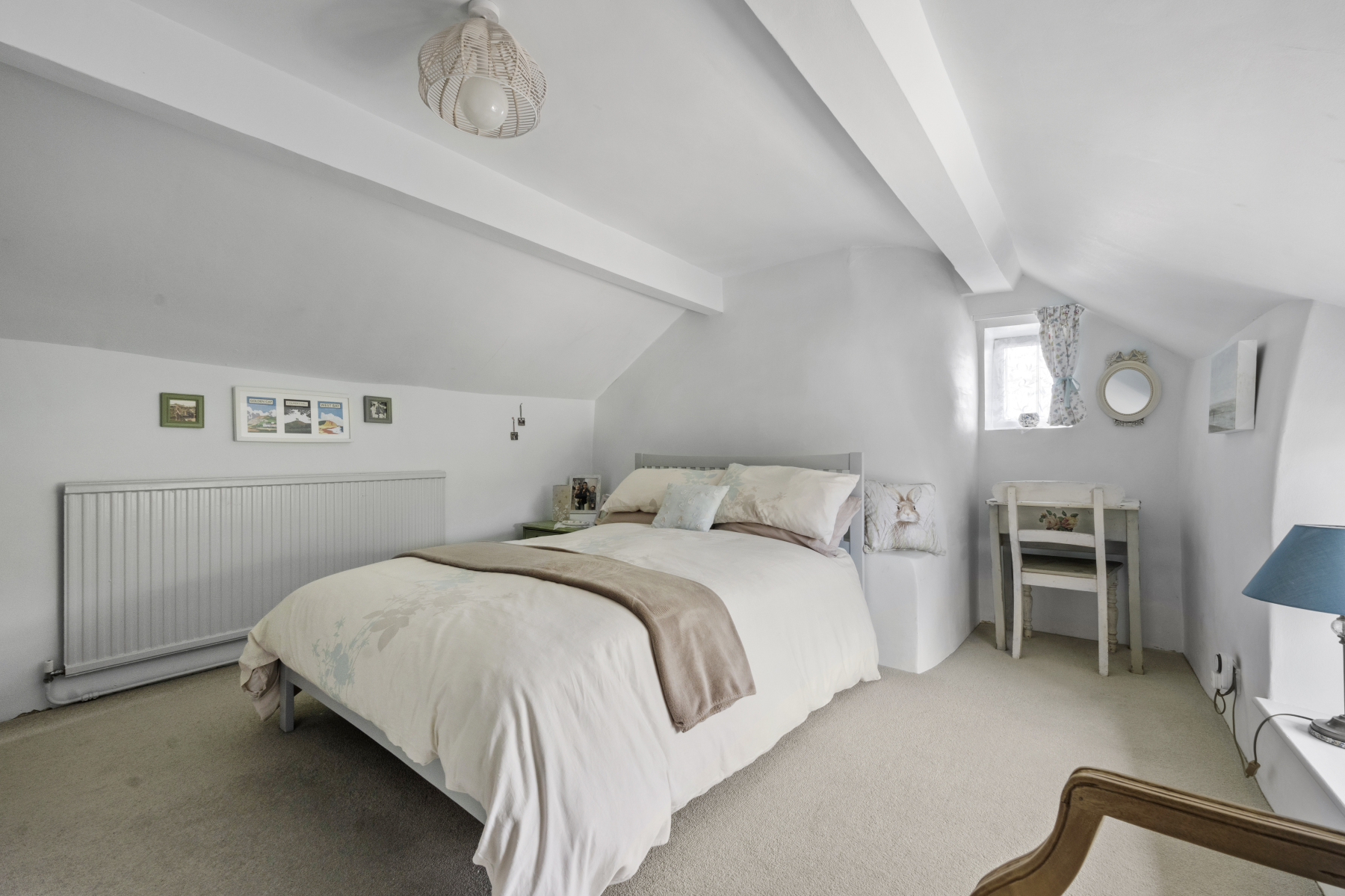 Next to the downstairs shower room is BEDROOM THREE, which can serve as a study or guest room. This delightful space, bathed in light from its triple aspect windows, features exposed beams and offers charming views over the front garden. Whether used as a peaceful home office, creative studio, or occasional bedroom, this room provides exceptional flexibility to suit your lifestyle.