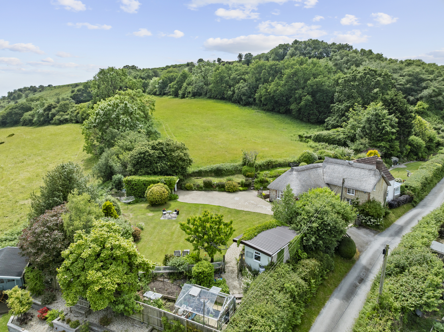 Green-thumbed buyers will adore the well-stocked vegetable garden, complete with raised beds and a greenhouse. Mature shrubs and trees grace the expansive lawns, which wrap around the property and flow seamlessly into the secondary westerly gardenthe perfect haven for alfresco dining and summer relaxation. A further wild area beyond the secondary parking space adds a touch of natural whimsy, enclosed by a mixture of mature hedgerows and timber fencing, ensuring both privacy and tranquillity.
