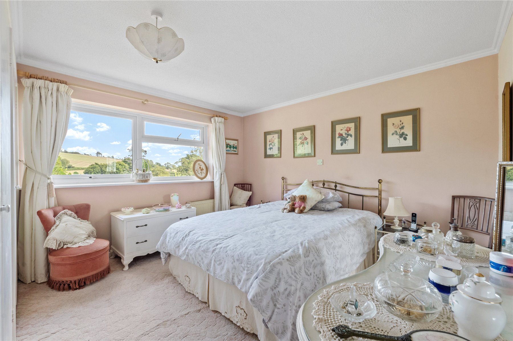 Upstairs, the LANDING is bright and spacious, with a window to the front, an airing cupboard, and access to the loft (partially boarded for extra storage). The PRINCIPAL BEDROOM is a peaceful retreat, with built-in wardrobes and truly beautiful views across the rear garden and undulating hills beyond. Its EN-SUITE includes a bath, W.C., pedestal wash hand basin, and chrome towel raileverything youd expect from a comfortable principal suite.