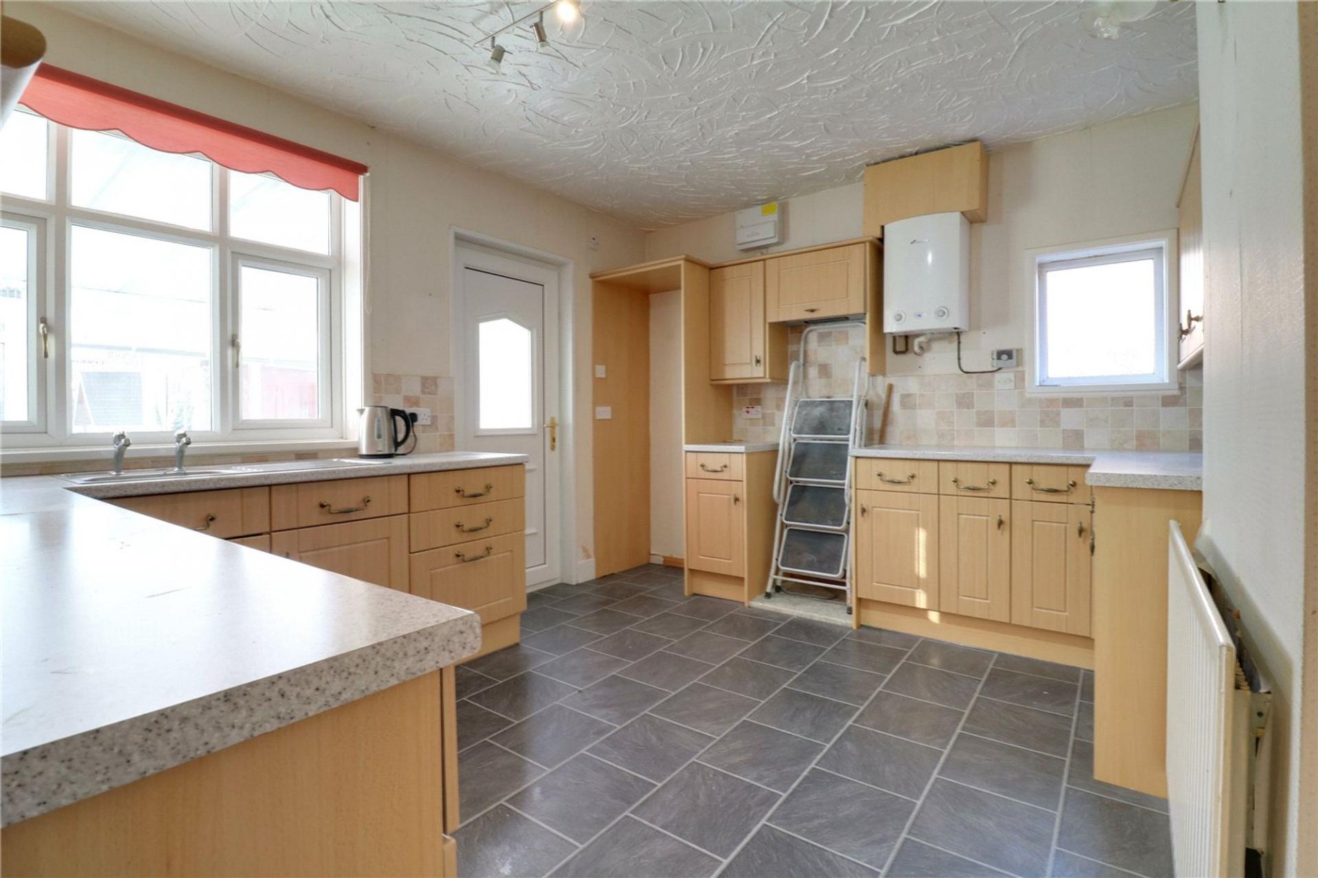 Including a dual aspect with side and rear uPVC double glazed windows. The kitchen includes a range of pine fronted low level units, drawer units and wall units with rounded pull handles and a patterned working top surface incorporating a one and a half single stainless steel sink unit, space for a free standing cooker, space for a free standing fridge freezer, wall mounted Worcester Bosch gas boiler with adjoining thermostat, a single wall light, ceiling spotlights and a rear uPVC double glazed door allows access to;