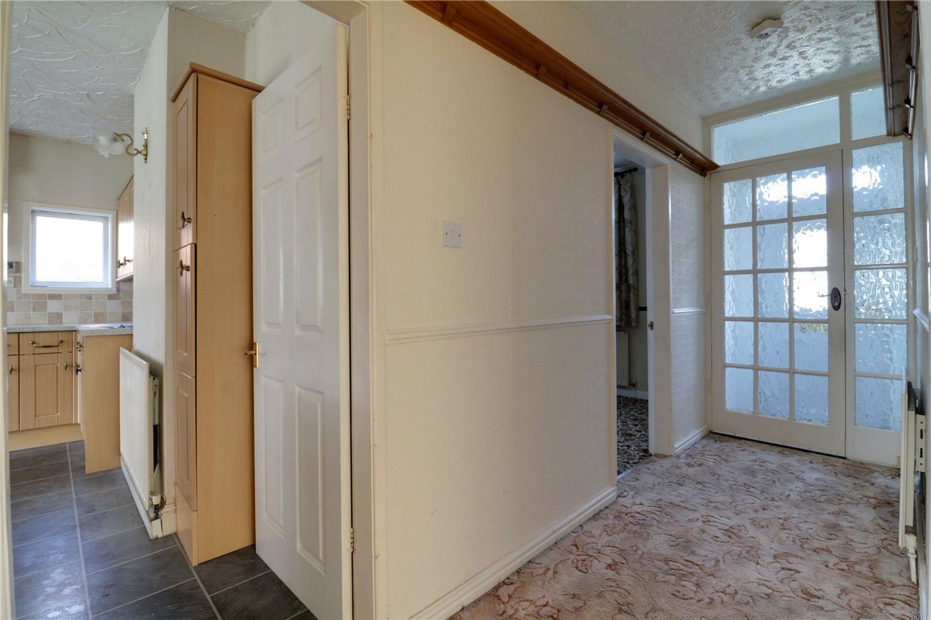 Includes a front uPVC double glazed entrance door with inset patterned glazing with adjoining top light with frosted glazing, a hardwood glazed door allows access through to;