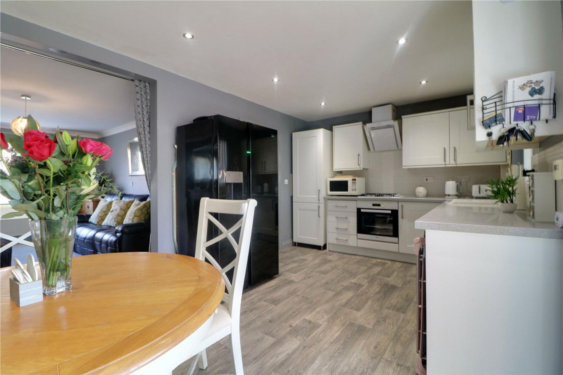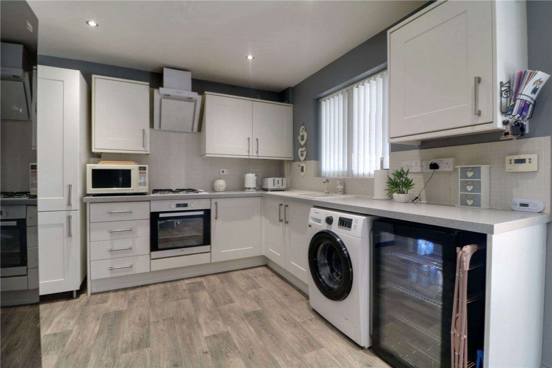 With a rear uPVC double glazed window. The kitchen includes a range of light shaker style low level units, drawer units and wall units with brushed aluminium style pull handles with a patterned working top surface incorporating a one and a half ceramic sink bowl unit with block mixer tap and drainer to the side, built-in Beko electric oven with four ring Belling gas hob with overhead canopied extractor fan, plumbing for a washing machine, space for a tall American style fridge freezer, space for an undercounter fridge, oak style vinyl flooring, inset ceiling spotlights, a wall mounted Ideal Classic gas boiler and an opening that leads through to;