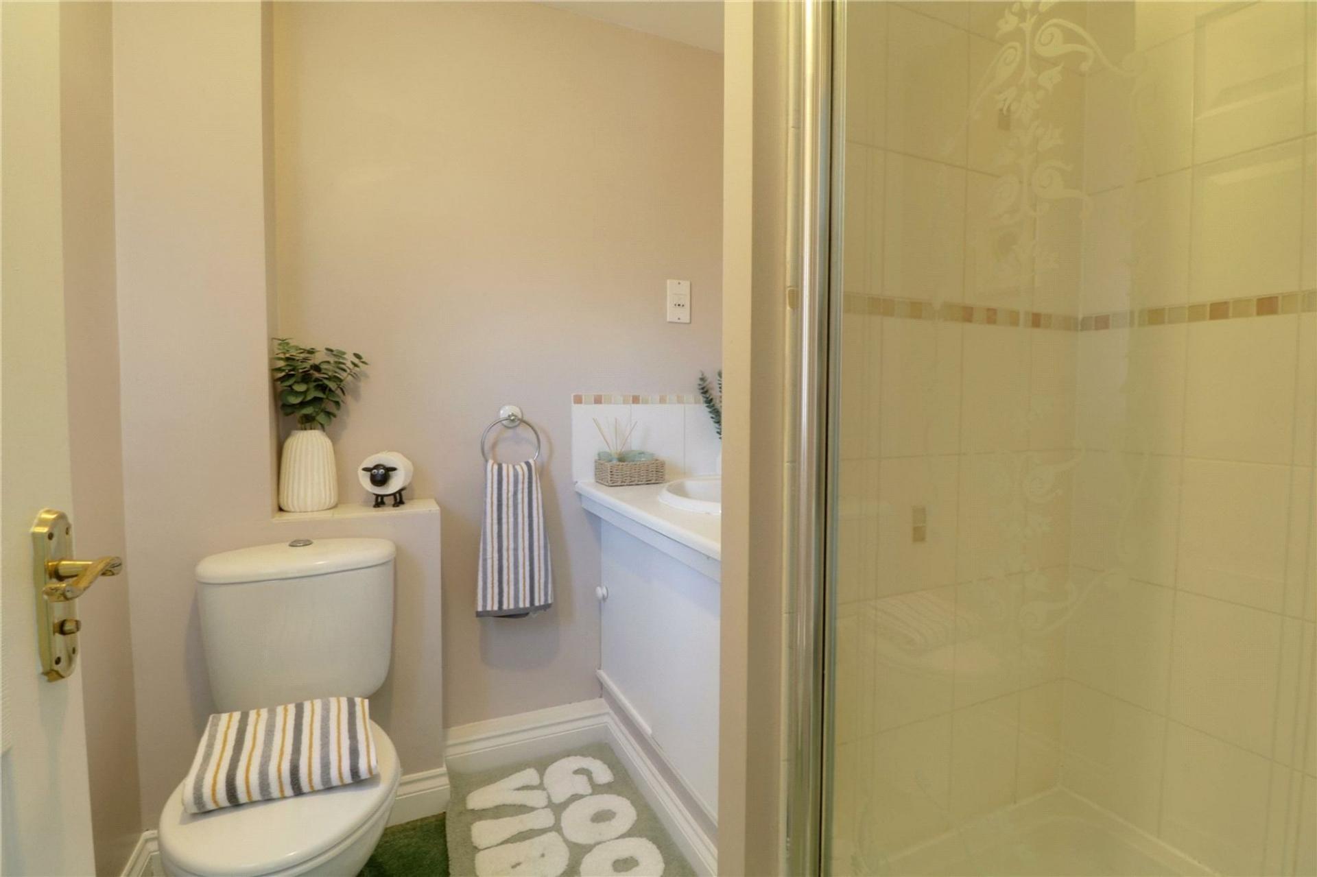 With a front uPVC double glazed window with frosted glazing, a three piece suite comprising a low flush WC, an oval wash hand basin and a single walk-in shower cubicle with overhead chrome mains shower.