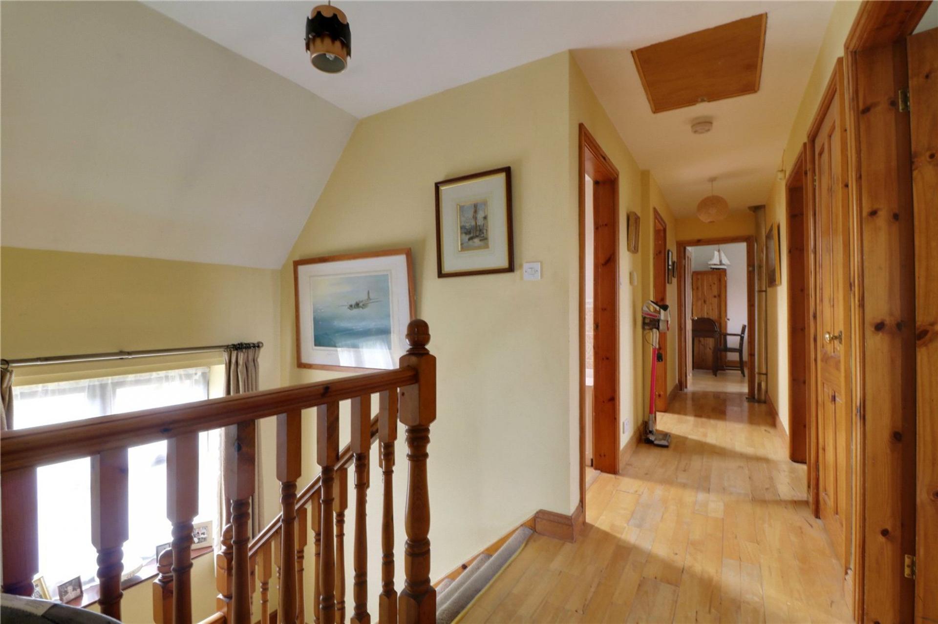 With a multi aspect including front and side uPVC double glazed windows, wall to ceiling coving and TV input. The kitchen enjoys a patterned working top surface with oak style low level units, drawer units and wall units with glazed fronts and a one and a half ceramic sink bowl unit with block mixer tap and drainer to the side with tiled splash backs, space for an undercounter fridge, oak style vinyl flooring, further side barn style hardwood double glazed door allowing access to the driveway, loft access and a log legged staircase leads to the first floor off the annex.