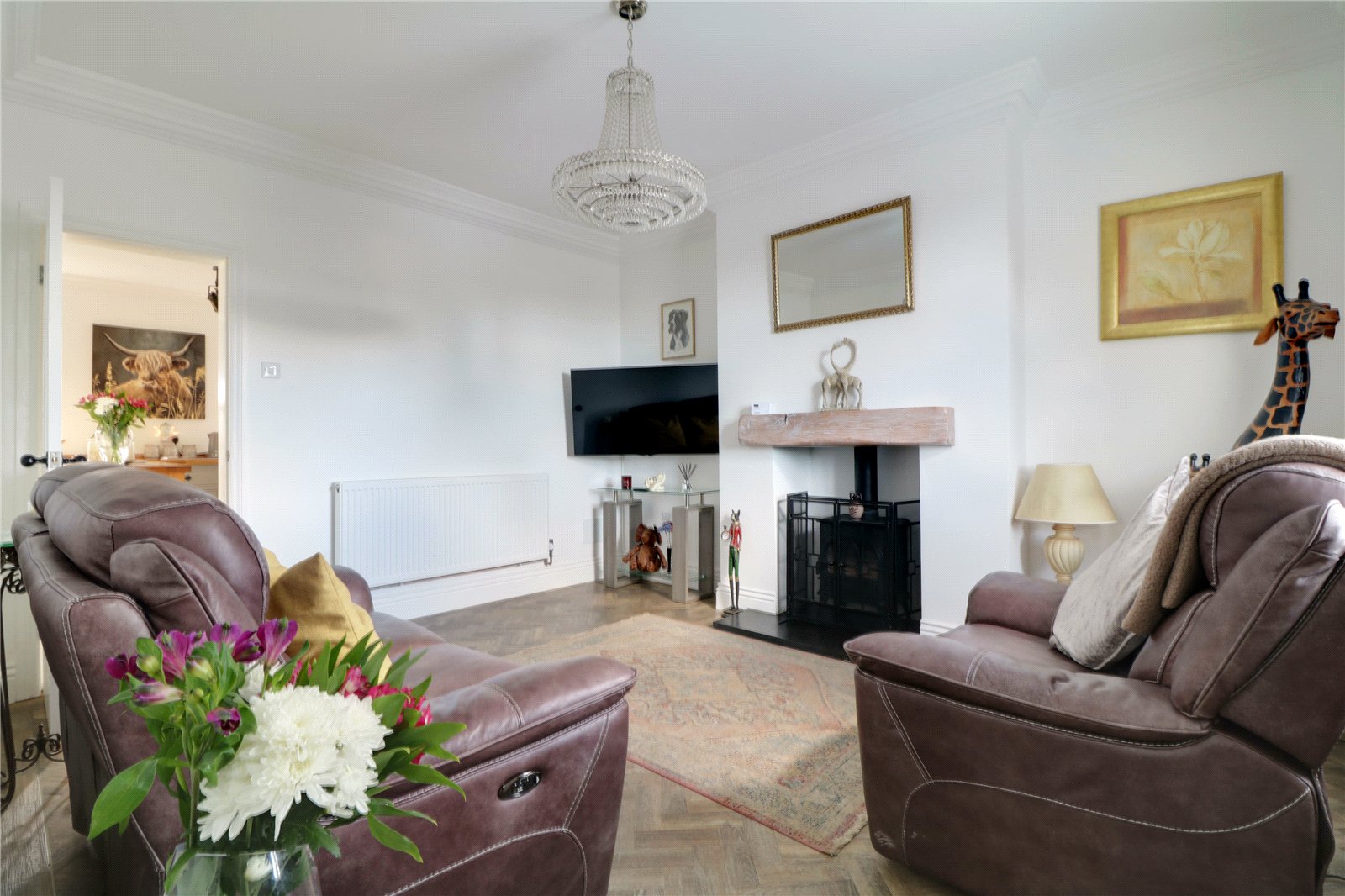 The central hallway leads to two front-facing reception rooms, each featuring a cast iron multi-fuel stove, creating a warm and inviting atmosphere. The bespoke fitted kitchen benefits from a practical understairs pantry and flows seamlessly into a light and airy rear conservatory, which overlooks the landscaped garden.