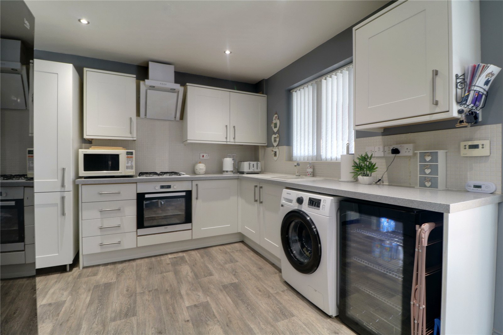 Kitchen/Diner 9'8" x 17'5" (2.95m x 5.3m). With a rear uPVC double glazed window. The kitchen includes a range of light shaker style low level units, drawer units and wall units with brushed aluminium style pull handles with a patterned working top surface incorporating a one and a half ceramic sink bowl unit with block mixer tap and drainer to the side, built-in Beko electric oven with four ring Belling gas hob with overhead canopied extractor fan, plumbing for a washing machine, space for a tall American style fridge freezer, space for an undercounter fridge, oak style vinyl flooring, inset ceiling spotlights, a wall mounted Ideal Classic gas boiler and an opening that leads through to;