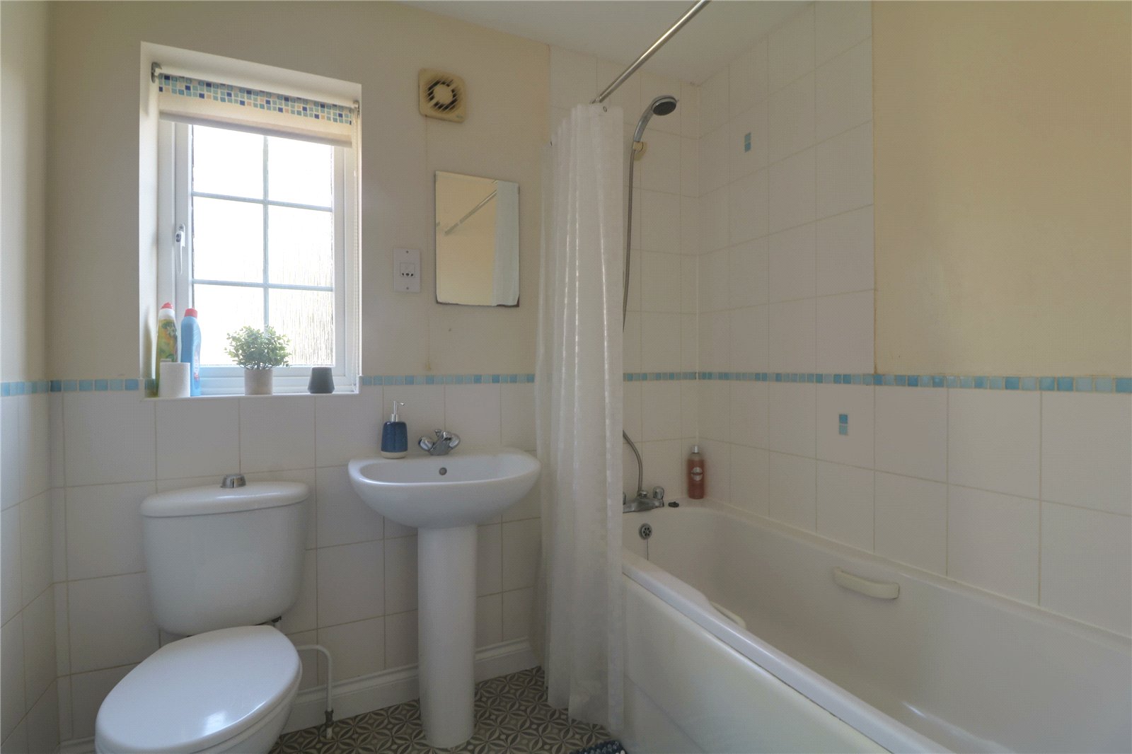Main Family Bathroom 7'1" x 5'7" (2.16m x 1.7m). With a side uPVC double glazed window with frosted glazing, a three piece suite comprising a low flush WC, pedestal wash hand basin and a panelled bath with overhead shower with tiled splash back, vinyl flooring, part tiled walls and extractor fan.