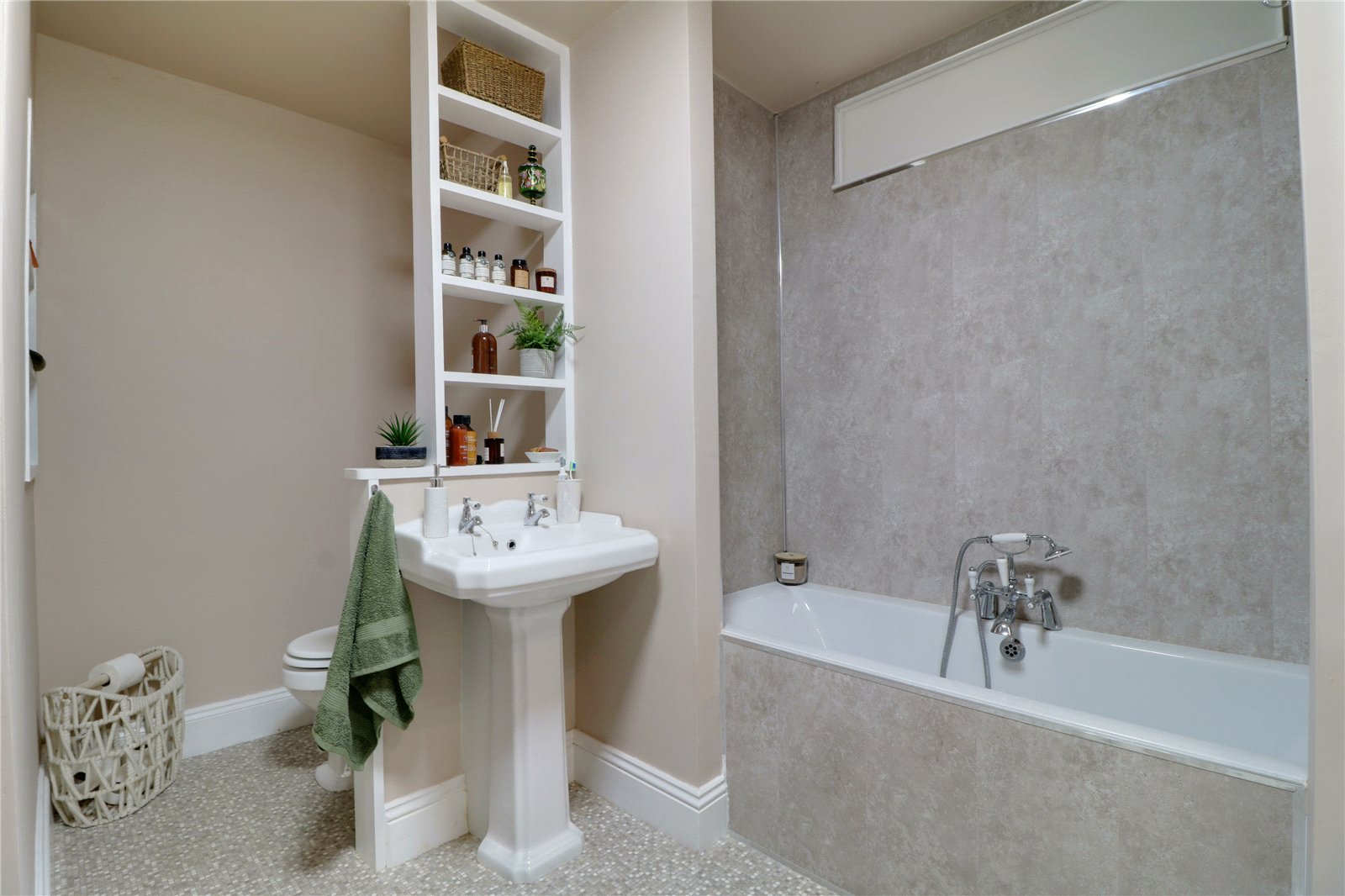 Main Family Bathroom 8'2" x 12'2" (2.5m x 3.7m). With a four piece suite comprising a double walk-in shower cubicle with overhead Mira electric shower with attractive mermaid boarding splash back with sliding glazed door, an inset bath area having a double ended bath with block mixer tap with further mermaid boarding and a glazed central window, pedestal wash hand basin with a low flush WC with inset shelving, cushioned flooring, a period single panelled radiator and extractor fan.
